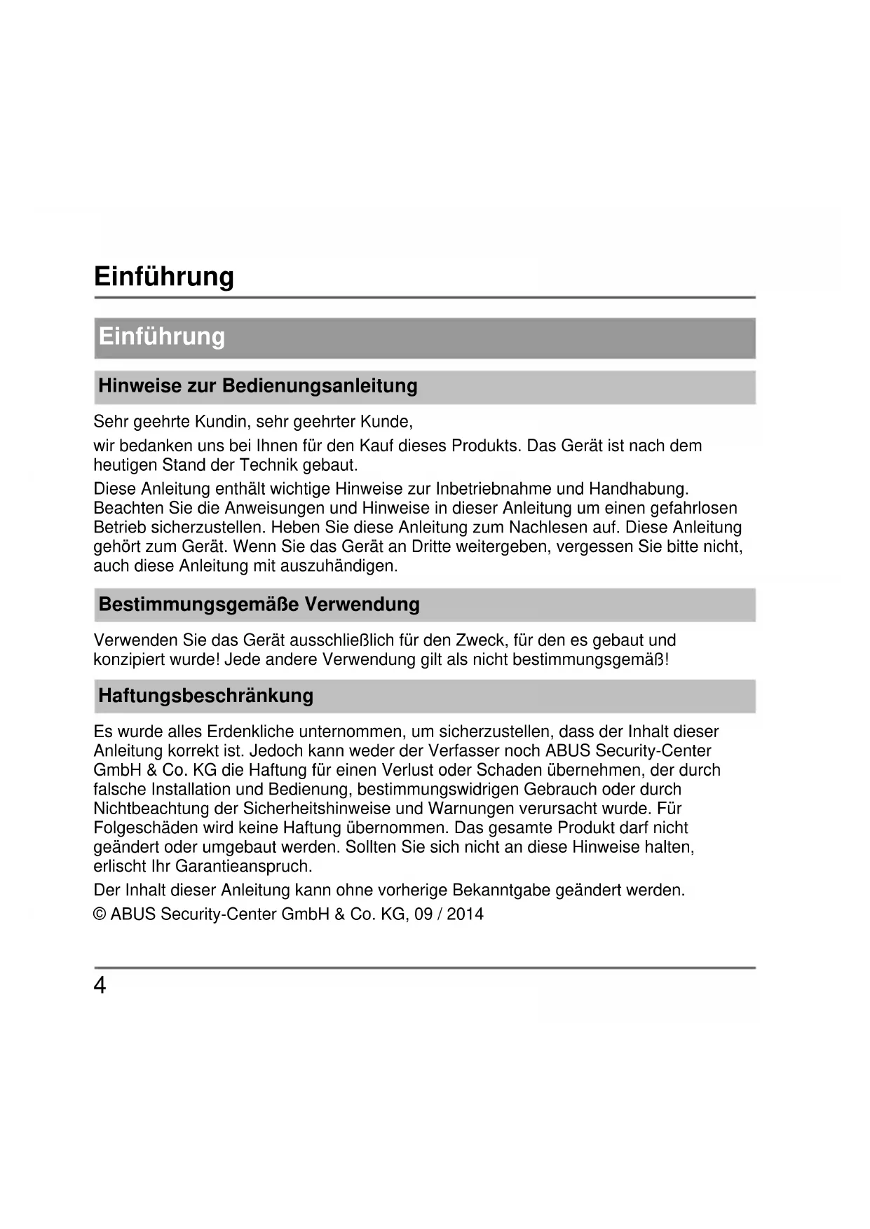 Einführung Hinweise zur Bedienungsanleitung Sehr geehrte Kundin, sehr geehrter Kunde, wir bedanken uns bei Ihnen für den Kauf dieses Produkts. Das Gerät ist nach dem heutigen Stand der Technik gebaut. Diese Anleitung enthält wichtige Hinweise zur Inbetriebnahme und Handhabung. Beachten Sie die Anweisungen und Hinweise in dieser Anleitung um einen gefahrlosen Betrieb sicherzustellen. Heben Sie diese Anleitung zum Nachlesen auf. Diese Anleitung gehört zum Gerät. Wenn Sie das Gerät an Dritte weitergeben, vergessen Sie bitte nicht, auch diese Anleitung mit auszuhändigen. Bestimmungsgemäße Verwendung Verwenden Sie das Gerät ausschließlich für den Zweck, für den es gebaut und konzipiert wurde! Jede andere Verwendung gilt als nicht bestimmungsgemäß! Haftungsbeschränkung Es wurde alles Erdenkliche unternommen, um sicherzustellen, dass der Inhalt dieser Anleitung korrekt ist. Jedoch kann weder der Verfasser noch ABUS Security-Center GmbH & Co. KG die Haftung für einen Verlust oder Schaden übernehmen, der durch falsche Installation und Bedienung, bestimmungswidrigen Gebrauch oder durch Nichtbeachtung der Sicherheitshinweise und Warnungen verursacht wurde. Für Folgeschäden wird keine Haftung übernommen. Das gesamte Produkt darf nicht geändert oder umgebaut werden. Sollten Sie sich nicht an diese Hinweise halten, erlischt Ihr Garantieanspruch. Der Inhalt dieser Anleitung kann ohne vorherige Bekanntgabe geändert werden. © ABUS Security-Center GmbH & Co. KG, 09 / 2014Sicherheitshinweise