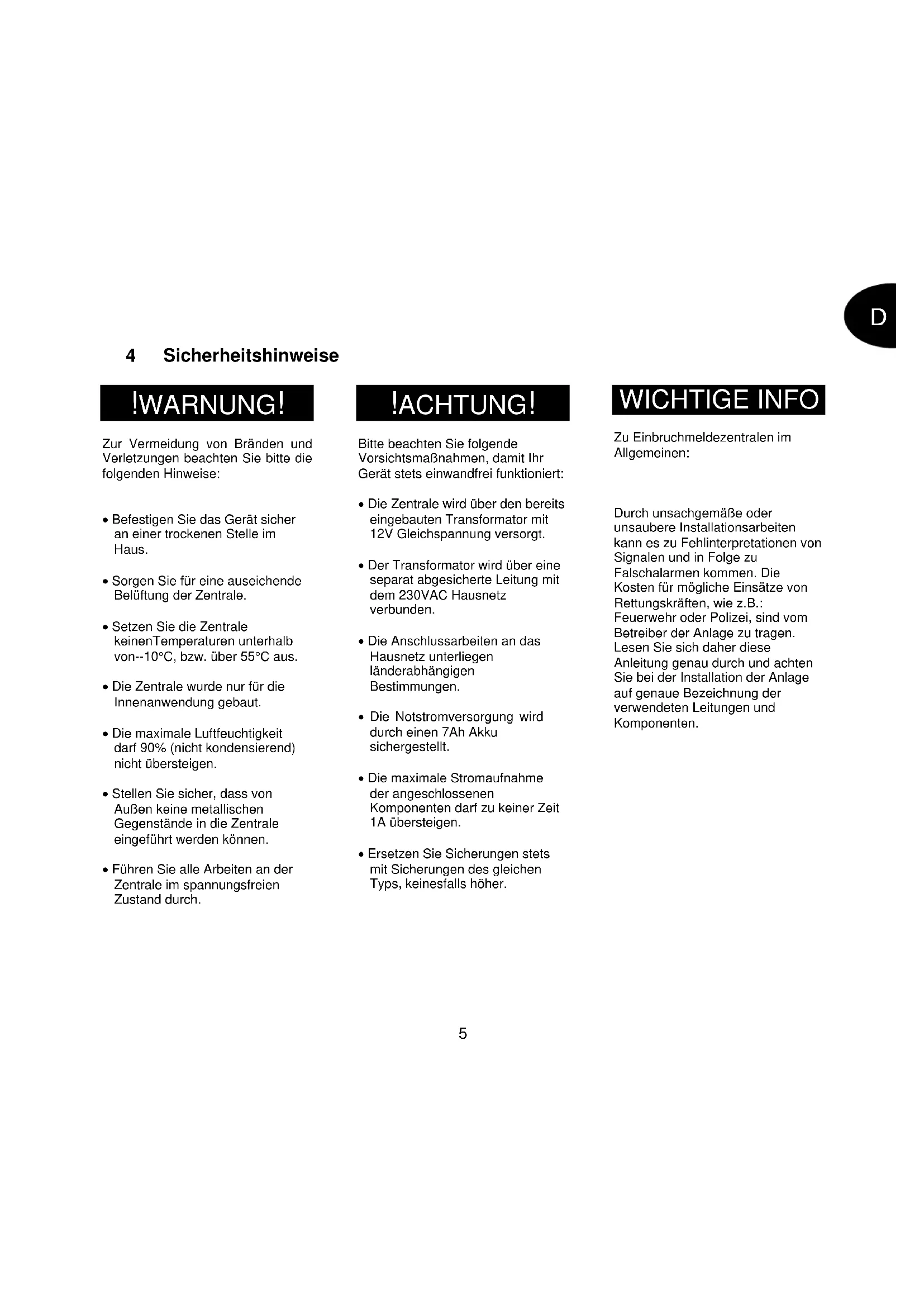 - Ersetzen Sie Sicherungen stets mit Sicherungen des gleichen Typs, keinesfalls höher. WICHTIGE INFO Zu Einbruchmeldezentralen im Allgemeinen: