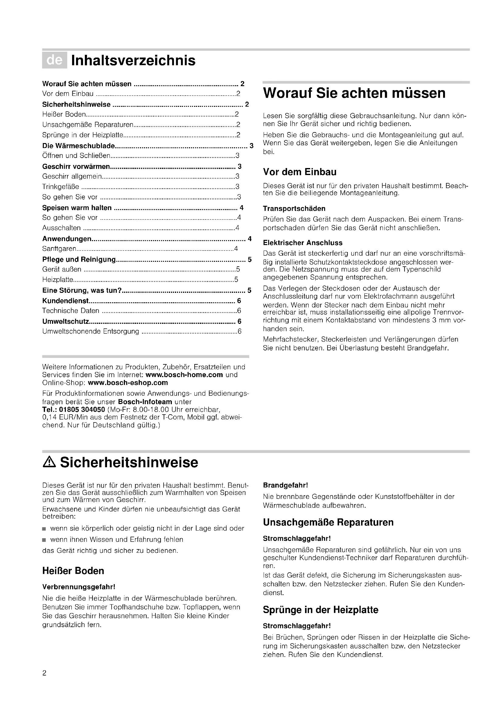 - Umweltschonende Entsorgung Produktinfo Weitere Informationen zu Produkten, Zubehör, Ersatzteilen und Services finden Sie im Internet: www.bosch-home.com und Online-Shop: www.bosch-eshop.com Für Produktinformationen sowie Anwendungs- und Bedienungs- fragen berät Sie unser Bosch-Infoteam unter Tel.: 01805 304050 (Mo-Fr: 8.00-18.00 Uhr erreichbar, 0,14 EUR/Min aus dem Festnetz der T-Com, Mobil ggf. abwei- chend. Nur für Deutschland gültig.) Worauf Sie achten müssen Lesen Sie sorgfältig diese Gebrauchsanleitung. Nur dann kön- nen Sie Ihr Gerät sicher und richtig bedienen. Heben Sie die Gebrauchs- und die Montageanleitung gut auf. Wenn Sie das Gerät weitergeben, legen Sie die Anleitungen bei. Vor dem Einbau Dieses Gerät ist nur für den privaten Haushalt bestimmt. Beach- ten Sie die beiliegende Montageanleitung. Transportschäden Prüfen Sie das Gerät nach dem Auspacken. Bei einem Trans- portschaden dürfen Sie das Gerät nicht anschließen. Elektrischer Anschluss Das Gerät ist steckerfertig und darf nur an eine vorschriftsmä- ßig installierte Schutzkontaktsteckdose angeschlossen wer- den. Die Netzspannung muss der auf dem Typenschild angegebenen Spannung entsprechen. Das Verlegen der Steckdosen oder der Austausch der Anschlussleitung darf nur vom Elektrofachmann ausgeführt werden. Wenn der Stecker nach dem Einbau nicht mehr erreichbar ist, muss installationsseitig eine allpolige Trennvor- richtung mit einem Kontaktabstand von mindestens 3 mm vor- handen sein. Mehrfachstecker, Steckerleisten und Verlängerungen dürfen Sie nicht benutzen. Bei Überlastung besteht Brandgefahr. ã=Sicherheitshinweise Dieses Gerät ist nur für den privaten Haushalt bestimmt. Benut- zen Sie das Gerät ausschließlich zum Warmhalten von Speisen und zum Wärmen von Geschirr. Erwachsene und Kinder dürfen nie unbeaufsichtigt das Gerät betreiben: ■ wenn sie körperlich oder geistig nicht in der Lage sind oder ■ wenn ihnen Wissen und Erfahrung fehlen das Gerät richtig und sicher zu bedienen. Heißer Boden Verbrennungsgefahr! Nie die heiße Heizplatte in der Wärmeschublade berühren. Benutzen Sie immer Topfhandschuhe bzw. Topflappen, wenn Sie das Geschirr herausnehmen. Halten Sie kleine Kinder grundsätzlich fern. Brandgefahr! Nie brennbare Gegenstände oder Kunststoffbehälter in der Wärmeschublade aufbewahren. Unsachgemäße Reparaturen Stromschlaggefahr! Unsachgemäße Reparaturen sind gefährlich. Nur ein von uns geschulter Kundendienst-Techniker darf Reparaturen durchfüh- ren. Ist das Gerät defekt, die Sicherung im Sicherungskasten aus- schalten bzw. den Netzstecker ziehen. Rufen Sie den Kunden- dienst. Sprünge in der Heizplatte Stromschlaggefahr! Bei Brüchen, Sprüngen oder Rissen in der Heizplatte die Siche- rung im Sicherungskasten ausschalten bzw. den Netzstecker ziehen. Rufen Sie den Kundendienst.3 Die Wärmeschublade In der Wärmeschublade können Sie Geschirr vorwärmen oder Speisen warm halten. Das Gerät heizt nur, wenn die Schublade richtig geschlossen ist. Öffnen und Schließen Bei Geräten ohne Griff: Drücken Sie auf die Mitte der Schublade, um sie zu öffnen oder zu schließen. Beim Öffnen springt die Schublade leicht heraus. Sie kann danach problemlos herausgezogen werden. Geschirr vorwärmen Im vorgewärmten Geschirr kühlen Speisen nicht so schnell ab. Getränke bleiben länger warm. Geschirr allgemein Die Wärmeschublade dürfen Sie mit maximal 25 kg belasten. Sie können z.B. Menügeschirr für 6 bzw. 12 Personen vorwär- men. Geschirr einräumen Verteilen Sie das Geschirr möglichst auf der ganzen Fläche. Hohe Tellerstapel werden langsamer durchwärmt als einzelne Geschirrteile, wie z.B. 2 Schüsseln. Trinkgefäße Erwärmen Sie Trinkgefäße wie z.B. Espressotassen immer mit Stufe 2. ã=Verbrennungsgefahr! Bei Stufe 3 oder 4 werden die Trinkgefäße sehr heiß. So gehen Sie vor p. 6