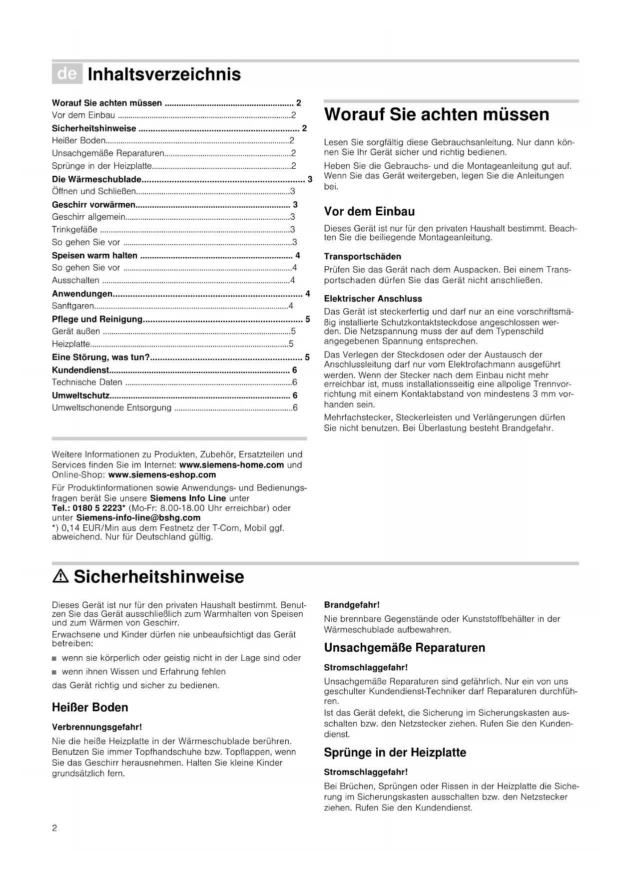 - Umweltschonende Entsorgung Produktinfo Weitere Informationen zu Produkten, Zubehör, Ersatzteilen und Services finden Sie im Internet: www.siemens-home.com und Online-Shop: www.siemens-eshop.com Für Produktinformationen sowie Anwendungs- und Bedienungs- fragen berät Sie unsere Siemens Info Line unter Tel.: 0180 5 2223* (Mo-Fr: 8.00-18.00 Uhr erreichbar) oder unter Siemens-info-line@bshg.com *) 0,14 EUR/Min aus dem Festnetz der T-Com, Mobil ggf. abweichend. Nur für Deutschland gültig. Worauf Sie achten müssen Lesen Sie sorgfältig diese Gebrauchsanleitung. Nur dann kön- nen Sie Ihr Gerät sicher und richtig bedienen. Heben Sie die Gebrauchs- und die Montageanleitung gut auf. Wenn Sie das Gerät weitergeben, legen Sie die Anleitungen bei. Vor dem Einbau Dieses Gerät ist nur für den privaten Haushalt bestimmt. Beach- ten Sie die beiliegende Montageanleitung. Transportschäden Prüfen Sie das Gerät nach dem Auspacken. Bei einem Trans- portschaden dürfen Sie das Gerät nicht anschließen. Elektrischer Anschluss Das Gerät ist steckerfertig und darf nur an eine vorschriftsmä- ßig installierte Schutzkontaktsteckdose angeschlossen wer- den. Die Netzspannung muss der auf dem Typenschild angegebenen Spannung entsprechen. Das Verlegen der Steckdosen oder der Austausch der Anschlussleitung darf nur vom Elektrofachmann ausgeführt werden. Wenn der Stecker nach dem Einbau nicht mehr erreichbar ist, muss installationsseitig eine allpolige Trennvor- richtung mit einem Kontaktabstand von mindestens 3 mm vor- handen sein. Mehrfachstecker, Steckerleisten und Verlängerungen dürfen Sie nicht benutzen. Bei Überlastung besteht Brandgefahr. ã=Sicherheitshinweise Dieses Gerät ist nur für den privaten Haushalt bestimmt. Benut- zen Sie das Gerät ausschließlich zum Warmhalten von Speisen und zum Wärmen von Geschirr. Erwachsene und Kinder dürfen nie unbeaufsichtigt das Gerät betreiben: ■ wenn sie körperlich oder geistig nicht in der Lage sind oder ■ wenn ihnen Wissen und Erfahrung fehlen das Gerät richtig und sicher zu bedienen. Heißer Boden Verbrennungsgefahr! Nie die heiße Heizplatte in der Wärmeschublade berühren. Benutzen Sie immer Topfhandschuhe bzw. Topflappen, wenn Sie das Geschirr herausnehmen. Halten Sie kleine Kinder grundsätzlich fern. Brandgefahr! Nie brennbare Gegenstände oder Kunststoffbehälter in der Wärmeschublade aufbewahren. Unsachgemäße Reparaturen Stromschlaggefahr! Unsachgemäße Reparaturen sind gefährlich. Nur ein von uns geschulter Kundendienst-Techniker darf Reparaturen durchfüh- ren. Ist das Gerät defekt, die Sicherung im Sicherungskasten aus- schalten bzw. den Netzstecker ziehen. Rufen Sie den Kunden- dienst. Sprünge in der Heizplatte Stromschlaggefahr! Bei Brüchen, Sprüngen oder Rissen in der Heizplatte die Siche- rung im Sicherungskasten ausschalten bzw. den Netzstecker ziehen. Rufen Sie den Kundendienst.3 Die Wärmeschublade In der Wärmeschublade können Sie Geschirr vorwärmen oder Speisen warm halten. Das Gerät heizt nur, wenn die Schublade richtig geschlossen ist. Öffnen und Schließen Bei Geräten ohne Griff: Drücken Sie auf die Mitte der Schublade, um sie zu öffnen oder zu schließen. Beim Öffnen springt die Schublade leicht heraus. Sie kann danach problemlos herausgezogen werden. Geschirr vorwärmen Im vorgewärmten Geschirr kühlen Speisen nicht so schnell ab. Getränke bleiben länger warm. Geschirr allgemein Die Wärmeschublade dürfen Sie mit maximal 25 kg belasten. Sie können z.B. Menügeschirr für 6 bzw. 12 Personen vorwär- men. Geschirr einräumen Verteilen Sie das Geschirr möglichst auf der ganzen Fläche. Hohe Tellerstapel werden langsamer durchwärmt als einzelne Geschirrteile, wie z.B. 2 Schüsseln. Trinkgefäße Erwärmen Sie Trinkgefäße wie z.B. Espressotassen immer mit Stufe 2. ã=Verbrennungsgefahr! Bei Stufe 3 oder 4 werden die Trinkgefäße sehr heiß. So gehen Sie vor p. 6