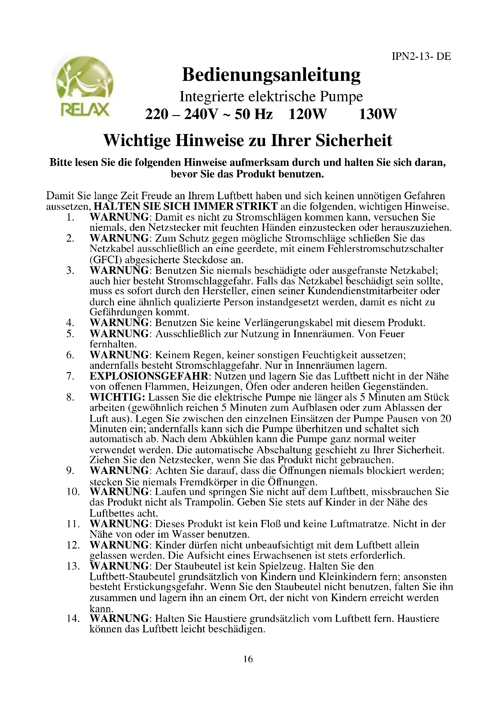 12. WARNUNG: Kinder dürfen nicht unbeaufsichtigt mit dem Luftbett allein