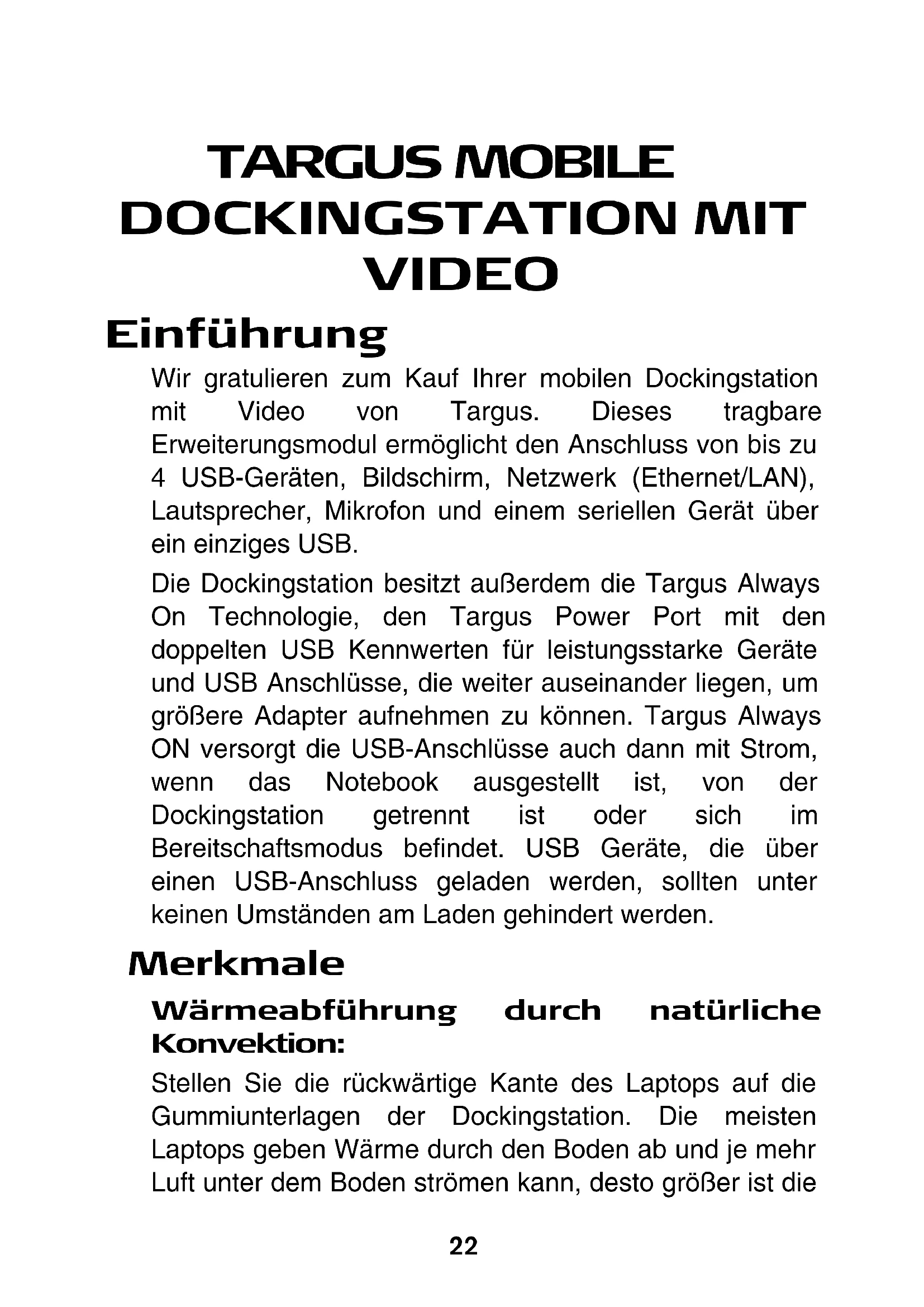 - Consult the dealer or an experienced radio/TV technician for help. Declaration of Conformity Hereby, Targus, declares that this device is in compliance with the essential requirements and other relevant provisions of Directive 1999/5/EC. Targus Recycling Directive At the end of this product’s useful life please dispose at an appropriate recycling collection point provided in your country. Targus recycling policy is available for viewing at: www.targus.com/recycling Changes or modifications not authorized by the party responsible for compliance could void the user’s authority to operate this product Microsoft, Windows, and Windows Vista are either registered trademarks or trademarks of Microsoft Corporation in the United States and/or other countries. All trademarks and registered trademarks are the properties of their respective owners. All rights reserved.22 TARGUS MOBILE DOCKINGSTATION MIT VIDEO Einführung Wir gratulieren zum Kauf Ihrer mobilen Dockingstation mit Video von Targus. Dieses tragbare Erweiterungsmodul ermöglicht den Anschluss von bis zu 4 USB-Geräten, Bildschirm, Netzwerk (Ethernet/LAN), Lautsprecher, Mikrofon und einem seriellen Gerät über ein einziges USB. Die Dockingstation besitzt außerdem die Targus Always On Technologie, den Targus Power Port mit den doppelten USB Kennwerten für leistungsstarke Geräte und USB Anschlüsse, die weiter auseinander liegen, um größere Adapter aufnehmen zu können. Targus Always ON versorgt die USB-Anschlüsse auch dann mit Strom, wenn das Notebook ausgestellt ist, von der Dockingstation getrennt ist oder sich im Bereitschaftsmodus befindet. USB Geräte, die über einen USB-Anschluss geladen werden, sollten unter keinen Umständen am Laden gehindert werden. Merkmale Wärmeabführung durch natürliche Konvektion: Stellen Sie die rückwärtige Kante des Laptops auf die Gummiunterlagen der Dockingstation. Die meisten Laptops geben Wärme durch den Boden ab und je mehr Luft unter dem Boden strömen kann, desto größer ist die23 Targus Mobile Dockingstation mit Video Möglichkeit, dass die Wärme durch natürliche Konvektion abgeführt wird. Komfort Die angehobene Plattform bietet eine bequemere Handstellung und einen erhöhten Luftfluss für eine bessere Kühlung. Die Dockingstation bietet die folgenden Anschlüsse: