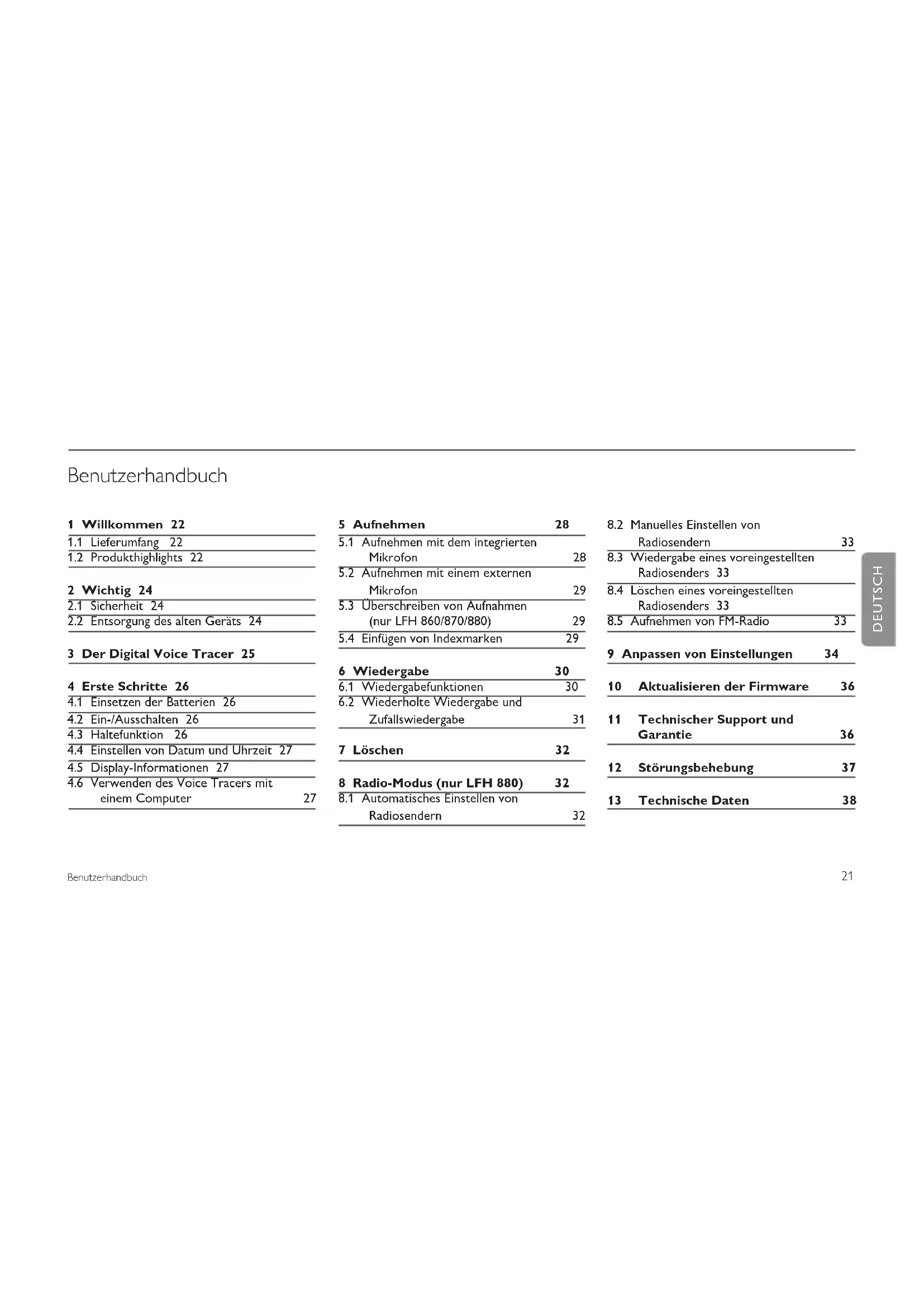 9 Anpassen von Einstellungen 34 10 Aktualisieren der Firmware 36 11 Technischer Support und Garantie 36 12 Störungsbehebung 37 13 Technische Daten 38 DEUTSCH22 Benutzerhandbuch Willkommen1 Herzlich willkommen bei Philips. Wir freuen uns, dass Sie sich für ein Gerät aus unserem Haus entschieden haben. Auf unserer Website erhalten Sie umfassende Unterstützung von Philips in Form von Benutzerhandbüchern, Softwaredownloads, Garantieinformationen und vielem mehr: www.philips.com/dictation. Lieferumfang 1.1 Produkthighlights1.2 Aufnahme Aufnahmen im beliebten MP3-Format.• Wählen Sie zwischen sechs Aufnahmemodi. Stereoaufnahmen in • unkomprimiertem PCM-Format* in Audio-CD-Qualität, zwei Stereo- Modi (SHQ und HQ), oder drei Mono-Modi (SP, LP und SLP) für längere Aufnahmedauer. Die einstellbare Aufnahmeempfindlichkeit ermöglicht die Anpassung • an die Aufnahmeumgebung und sorgt für die Vermeidung von Hintergrundgeräuschen. Der umfangreiche interne Speicher bietet nicht nur für die Aufnahme • selbst, sondern auch für die Speicherung von anderen Dateien ausreichend Kapazität. Im Modus• für sprachaktivierte Aufnahmen können freihändig Aufnahmen ohne Drücken der Aufnahmetaste gemacht werden. Mit der Funktion zum automatischen Teilen werden lange Aufnahmen • in separate Dateien gegliedert. So können beispielsweise umfangreiche Aufzeichnungen von Besprechungen oder Vorlesungen leichter gefunden, bearbeitet und archiviert werden. Aufnehmen mit Stromversorgung über USB ohne die Batterien zu • belasten.* Aufnahmen von externen Audioquellen über Line-in.*• Benutzerhandbuch Batterien Stereokopfhörer * USB-Kabel AnsteckmikrofonVoice Tracer Trageband *23 Benutzerhandbuch Der hohe Signal-Rauschabstand (S/N) des Mikrofons nimmt • jede Nuance der menschlichen Stimme auf und sorgt für eine hervorragende Tonwiedergabe. Wiedergabe Einstellbare Wiedergabegeschwindigkeit zur schnellen und langsamen • Wiedergabe von Aufnahmen. Wiederholte Wiedergabe von Audiodateien oder Teilen daraus.• Musikwiedergabe im MP3- und WMA-Format sowie FM-Radio *.• Wecker mit Sprachwiedergabe und Timer-Aufnahme.• Komfort Großes beleuchtetes Display für gut lesbare Anzeige.• Bis zu 22 Stunden Betriebszeit.• Schnelle Übertragung von Aufnahmen, Musik und Daten über USB • Highspeed 2.0. Schnelles Finden bestimmter Stellen in einer Aufnahme über • Indexmarken und Zeitmarken. Unterstützt bis zu 99 Aufnahmen in jedem der vier Ordner, sodass • Dateien schnell und einfach verwaltet werden können. Der Voice Tracer bietet als USB-Massenspeichergerät eine • unkomplizierte Möglichkeit zum Speichern, Sichern und Verschieben von Dateien ohne spezielle Software oder Treiber.