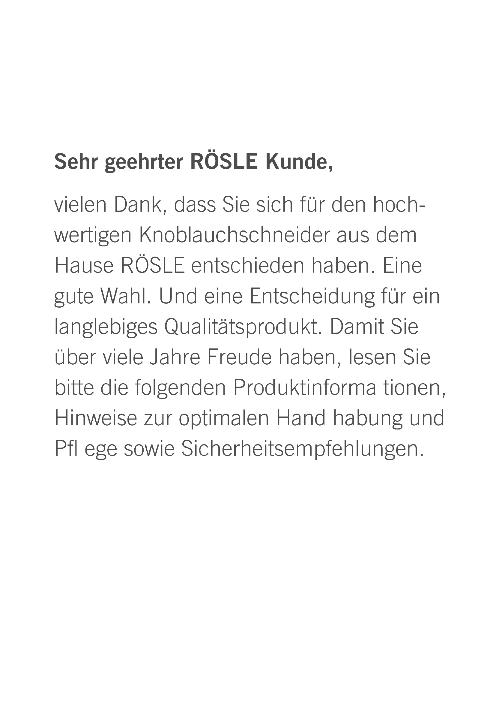 vielen Dank, dass Sie sich für den hoch- wertigen Knoblauchschneider aus dem Hause RÖSLE entschieden haben. Eine gute Wahl. Und eine Entscheidung für ein langlebiges Qualitätsprodukt. Damit Sie über viele Jahre Freude haben, lesen Sie bitte die folgenden Produktinforma tionen, Hinweise zur optimalen Hand habung und Pfl ege sowie Sicherheitsempfehlungen.