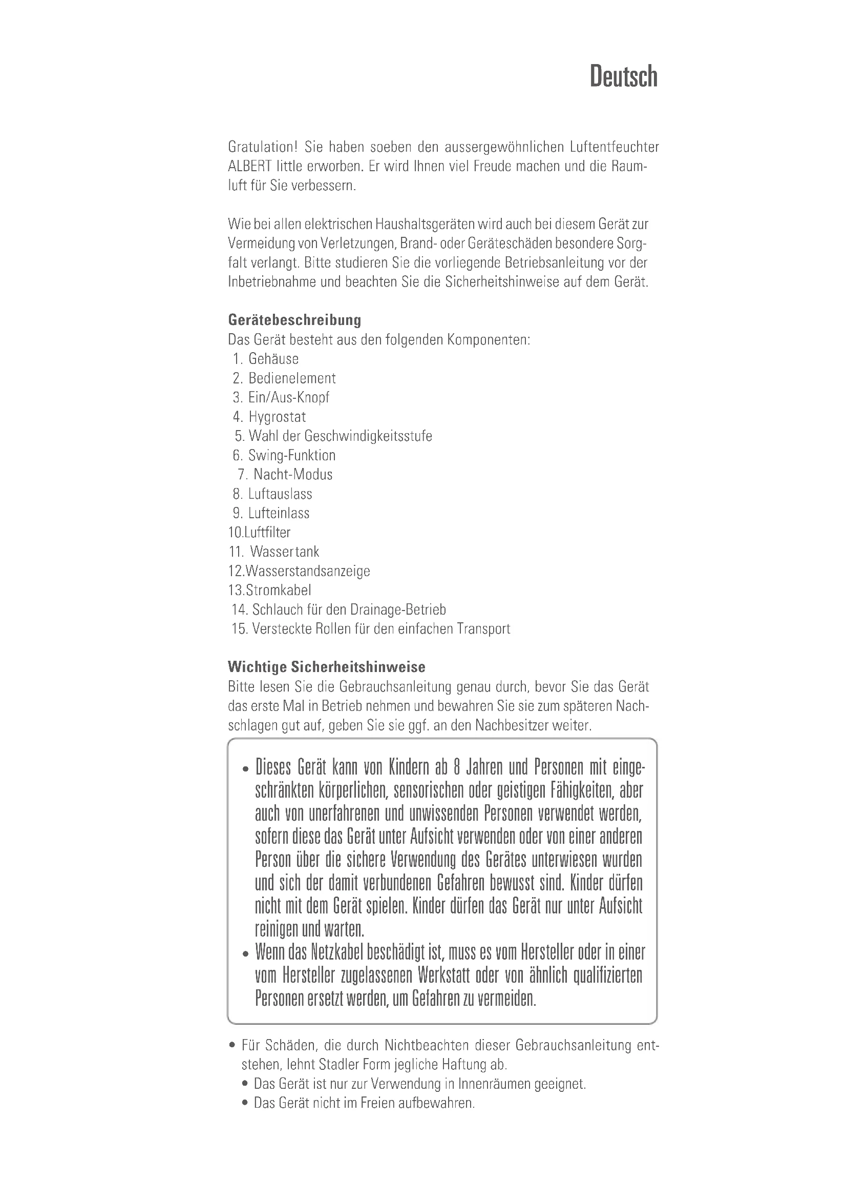 Dimensions 298 x 555 x 216 mm (width x height x depth) Weight 10.5 kg Tank capacity 2.0 L Max. capacity per day 10 L Sound level 32 – 43 dB(A) Refrigerant: R134a (120 g) Complies with EU regulations CE / WEEE / RoHS / EAC All rights for any technical modifications are reservedGratulation! Sie haben soeben den aussergewöhnlichen Luftentfeuchter ALBERT little erworben. Er wird Ihnen viel Freude machen und die Raum- luft für Sie verbessern. Wie bei allen elektrischen Haushaltsgeräten wird auch bei diesem Gerät zur Vermeidung von Verletzungen, Brand- oder Geräteschäden besondere Sorg- falt verlangt. Bitte studieren Sie die vorliegende Betriebsanleitung vor der Inbetriebnahme und beachten Sie die Sicherheitshinweise auf dem Gerät. Gerätebeschreibung Das Gerät besteht aus den folgenden Komponenten: