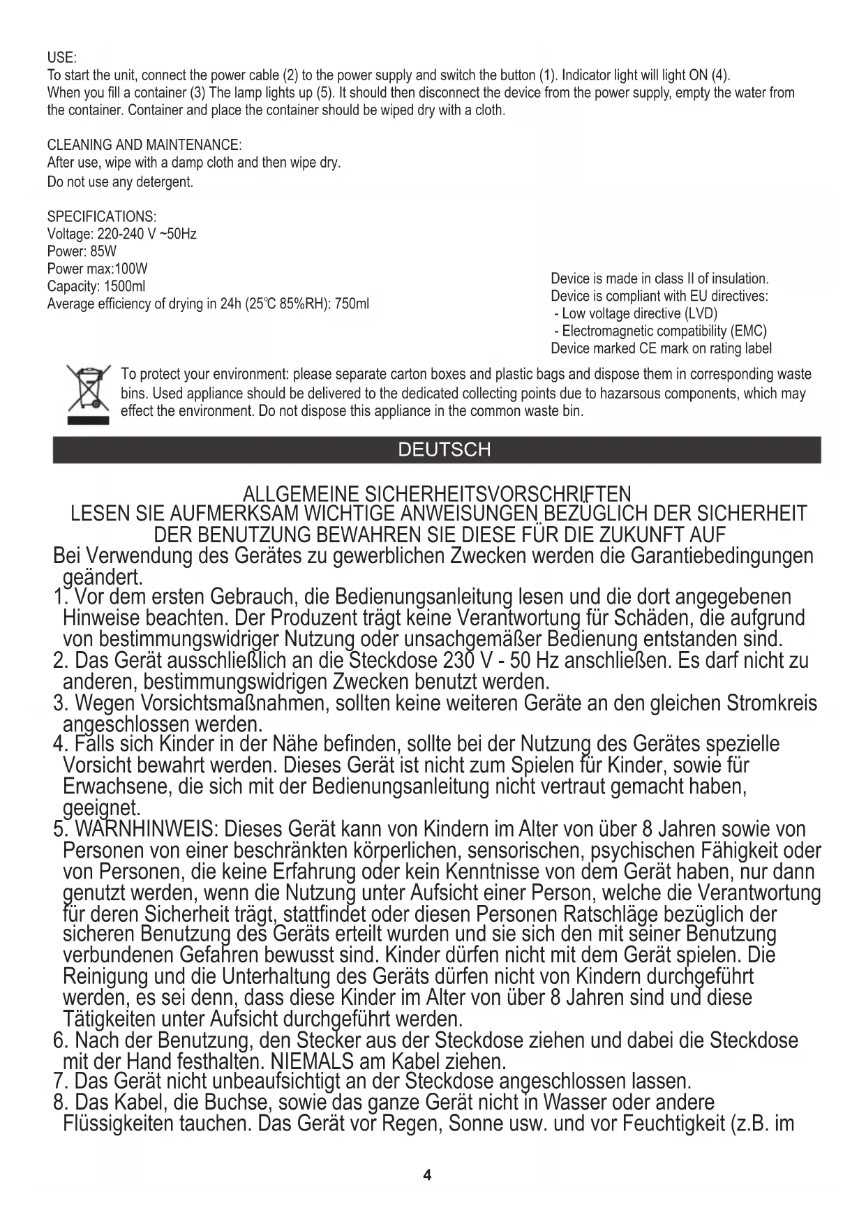 Durchschnittliche Trocknungseffizienz während der 24 Stunden (25 C 85%RH): 750ml Behältervolumen: 1500ml Wenn der Sammelbehälter (3) voll ist leuchtet die Kontrollleuchte (5) auf. Dann trennen Sie das Gerät vom Netz und entleeren Sie den Wasserbehälter. Wischen Sie den Behälter und den Behältersitz trocken. Um das Gerät in Betrieb zu setzen, stecken Sie den Netzkabel (2) in die Steckdose und schalten Sie die Taste (1) ein. Kontrollleuchte ON (4) leuchtet auf. REINIGUNG UND WARTUNG: Badezimmer oder Campingwagen) schützen.