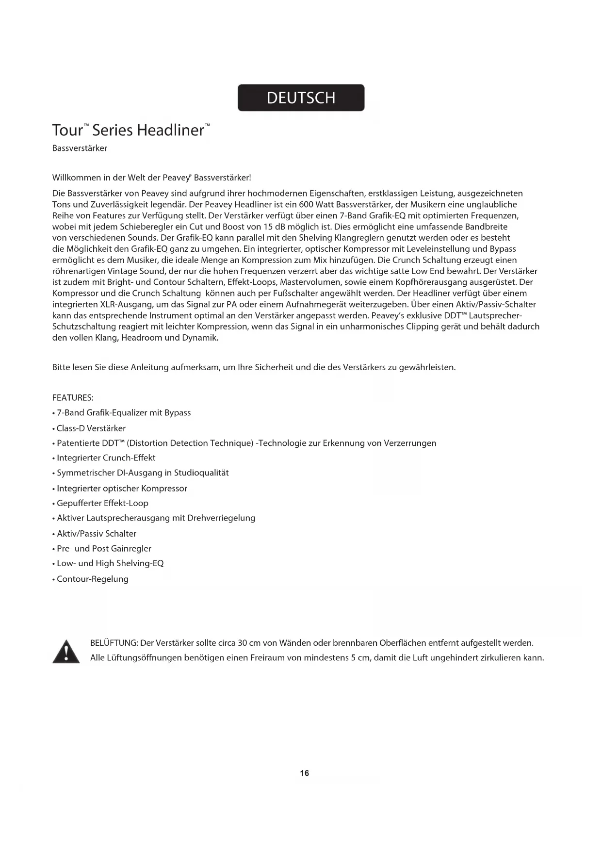 Bassverstärker! Die Bassverstärker von Peavey sind aufgrund ihrer hochmodernen Eigenschaften, erstklassigen Leistung, ausgezeichneten Tons und Zuverlässigkeit legendär. Der Peavey Headliner ist ein 600 Watt Bassverstärker, der Musikern eine unglaubliche Reihe von Features zur Verfügung stellt. Der Verstärker verfügt über einen 7-Band Grafik-EQ mit optimierten Frequenzen, wobei mit jedem Schieberegler ein Cut und Boost von 15 dB möglich ist. Dies ermöglicht eine umfassende Bandbreite von verschiedenen Sounds. Der Grafik-EQ kann parallel mit den Shelving Klangreglern genutzt werden oder es besteht die Möglichkeit den Grafik-EQ ganz zu umgehen. Ein integrierter, optischer Kompressor mit Leveleinstellung und Bypass ermöglicht es dem Musiker, die ideale Menge an Kompression zum Mix hinzufügen. Die Crunch Schaltung erzeugt einen röhrenartigen Vintage Sound, der nur die hohen Frequenzen verzerrt aber das wichtige satte Low End bewahrt. Der Verstärker ist zudem mit Bright- und Contour Schaltern, Effekt-Loops, Mastervolumen, sowie einem Kopfhörerausgang ausgerüstet. Der Kompressor und die Crunch Schaltung können auch per Fußschalter angewählt werden. Der Headliner verfügt über einem integrierten XLR-Ausgang, um das Signal zur PA oder einem Aufnahmegerät weiterzugeben. Über einen Aktiv/Passiv-Schalter kann das entsprechende Instrument optimal an den Verstärker angepasst werden. Peavey’s exklusive DDT™ Lautsprecher- Schutzschaltung reagiert mit leichter Kompression, wenn das Signal in ein unharmonisches Clipping gerät und behält dadurch den vollen Klang, Headroom und Dynamik. Bitte lesen Sie diese Anleitung aufmerksam, um Ihre Sicherheit und die des Verstärkers zu gewährleisten. FEATURES: