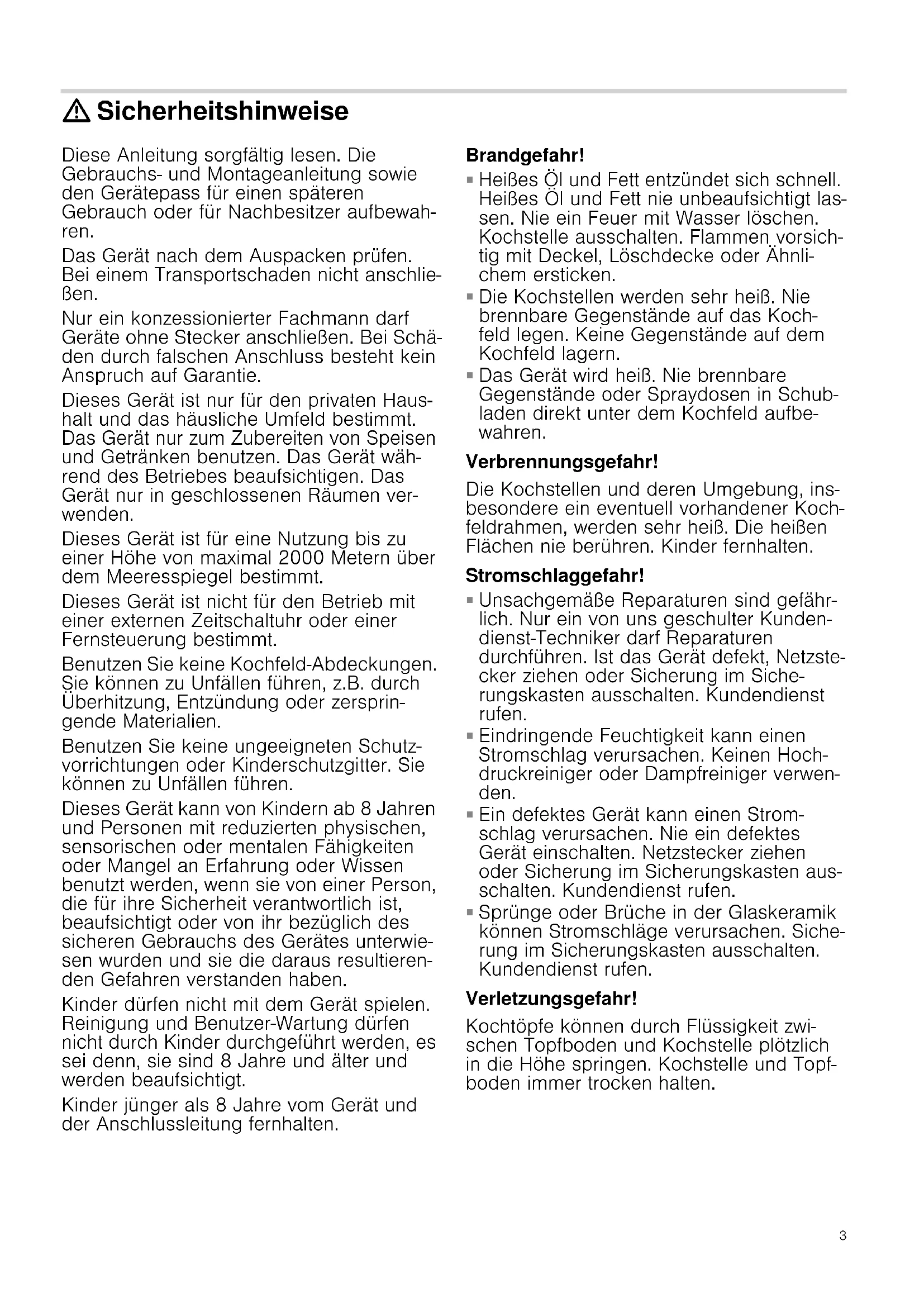 : Sicherheitshinweise Diese Anleitung sorgfältig lesen. Die Gebrauchs- und Montageanleitung sowie den Gerätepass für einen späteren Gebrauch oder für Nachbesitzer aufbewah- ren. Das Gerät nach dem Auspacken prüfen. Bei einem Transportschaden nicht anschlie- ßen. Nur ein konzessionierter Fachmann darf Geräte ohne Stecker anschließen. Bei Schä- den durch falschen Anschluss besteht kein Anspruch auf Garantie. Dieses Gerät ist nur für den privaten Haus- halt und das häusliche Umfeld bestimmt. Das Gerät nur zum Zubereiten von Speisen und Getränken benutzen. Das Gerät wäh- rend des Betriebes beaufsichtigen. Das Gerät nur in geschlossenen Räumen ver- wenden. Dieses Gerät ist für eine Nutzung bis zu einer Höhe von maximal 2000 Metern über dem Meeresspiegel bestimmt. Dieses Gerät ist nicht für den Betrieb mit einer externen Zeitschaltuhr oder einer Fernsteuerung bestimmt. Benutzen Sie keine Kochfeld-Abdeckungen. Sie können zu Unfällen führen, z.B. durch Überhitzung, Entzündung oder zersprin- gende Materialien. Benutzen Sie keine ungeeigneten Schutz- vorrichtungen oder Kinderschutzgitter. Sie können zu Unfällen führen. Dieses Gerät kann von Kindern ab 8 Jahren und Personen mit reduzierten physischen, sensorischen oder mentalen Fähigkeiten oder Mangel an Erfahrung oder Wissen benutzt werden, wenn sie von einer Person, die für ihre Sicherheit verantwortlich ist, beaufsichtigt oder von ihr bezüglich des sicheren Gebrauchs des Gerätes unterwie- sen wurden und sie die daraus resultieren- den Gefahren verstanden haben. Kinder dürfen nicht mit dem Gerät spielen. Reinigung und Benutzer-Wartung dürfen nicht durch Kinder durchgeführt werden, es sei denn, sie sind 8 Jahre und älter und werden beaufsichtigt. Kinder jünger als 8 Jahre vom Gerät und der Anschlussleitung fernhalten. Brandgefahr!