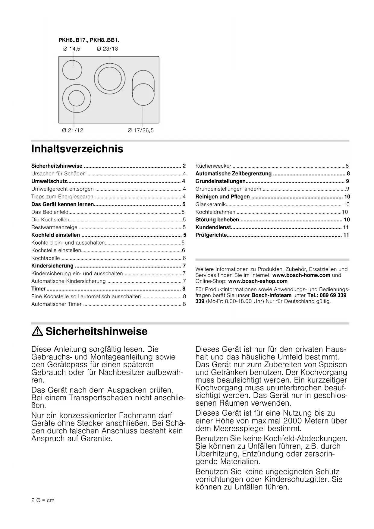 - Prüfgerichte Produktinfo Weitere Informationen zu Produkten, Zubehör, Ersatzteilen und Services finden Sie im Internet: www.bosch-home.com und Online-Shop: www.bosch-eshop.com Für Produktinformationen sowie Anwendungs- und Bedienungs- fragen berät Sie unser Bosch-Infoteam unter Tel.: 089 69 339 339 (Mo-Fr: 8.00-18.00 Uhr) Nur für Deutschland gültig. : Sicherheitshinweise Diese Anleitung sorgfältig lesen. Die Gebrauchs- und Montageanleitung sowie den Gerätepass für einen späteren Gebrauch oder für Nachbesitzer aufbewah- ren. Das Gerät nach dem Auspacken prüfen. Bei einem Transportschaden nicht anschlie- ßen. Nur ein konzessionierter Fachmann darf Geräte ohne Stecker anschließen. Bei Schä- den durch falschen Anschluss besteht kein Anspruch auf Garantie. Dieses Gerät ist nur für den privaten Haus- halt und das häusliche Umfeld bestimmt. Das Gerät nur zum Zubereiten von Speisen und Getränken benutzen. Der Kochvorgang muss beaufsichtigt werden. Ein kurzzeitiger Kochvorgang muss ununterbrochen beauf- sichtigt werden. Das Gerät nur in geschlos- senen Räumen verwenden. Dieses Gerät ist für eine Nutzung bis zu einer Höhe von maximal 2000 Metern über dem Meeresspiegel bestimmt. Benutzen Sie keine Kochfeld-Abdeckungen. Sie können zu Unfällen führen, z.B. durch Überhitzung, Entzündung oder zersprin- gende Materialien. Benutzen Sie keine ungeeigneten Schutz- vorrichtungen oder Kinderschutzgitter. Sie können zu Unfällen führen. 3.+%3.+%% p. 11