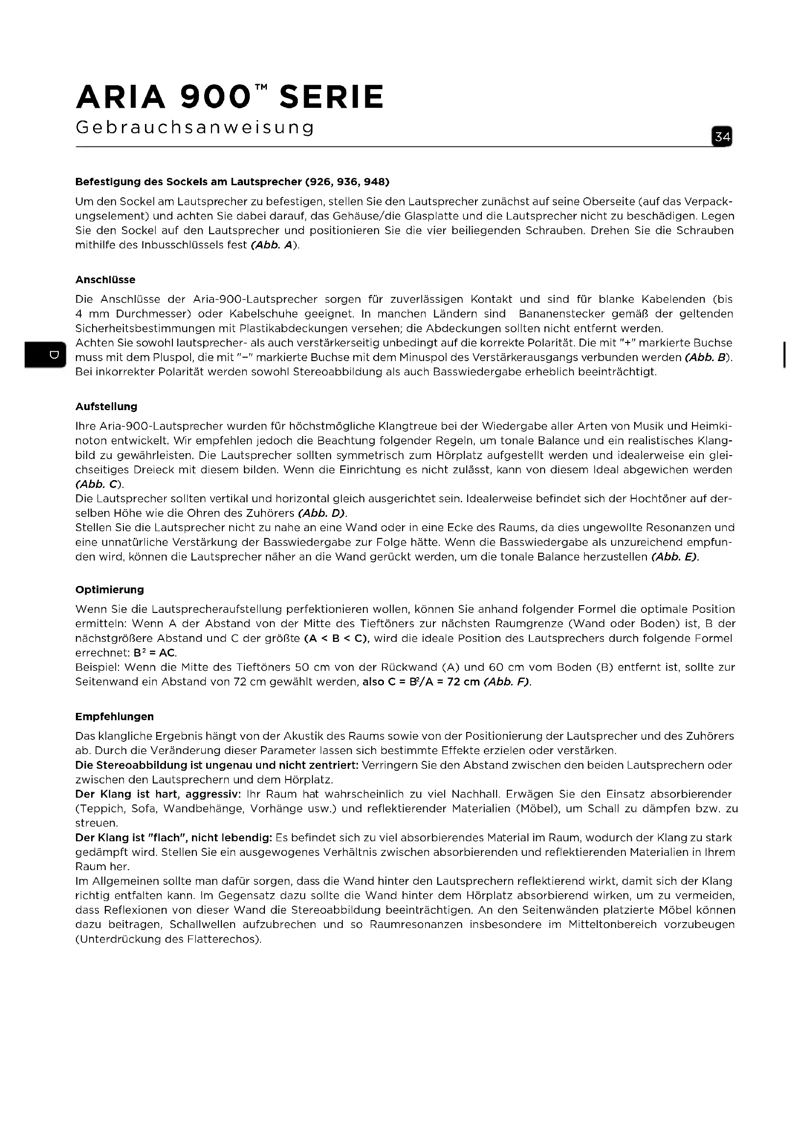Ohr t h r d w. n e t zu hohe Lautstärke gewahlt wird, errecht der Verstarker den Sattigungsbereich und erzeugt Storsignale, die den Hochtner beschädigen konnen. Die dynamische Kapazitat und das Auflösungsvermögen der Aria-900-Laufsprecher sind groq genug, um die Qualitäten oder Fehler≦es angeschlossenen Verstarkers aufzuzeigen. Ihr Handler wird Ihnen bei der Wahl eines passenden Verstarkers behilflich sein.