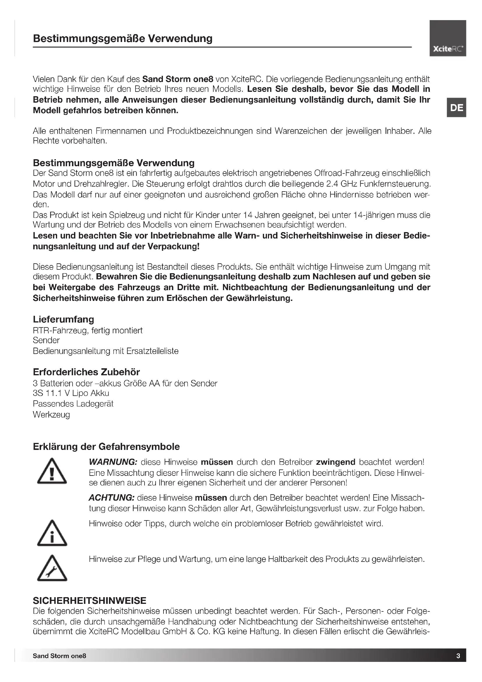 Bestimmungsgemäße Verwendung Vielen Dank für den Kauf des Sand Storm one8 von XciteRC. Die vorliegende Bedienungsanleitung enthält wichtige Hinweise für den Betrieb Ihres neuen Modells. Lesen Sie deshalb, bevor Sie das Modell in Betrieb nehmen, alle Anweisungen dieser Bedienungsanleitung vollständig durch, damit Sie Ihr Modell gefahrlos betreiben können. Alle enthaltenen Firmennamen und Produktbezeichnungen sind Warenzeichen der jeweiligen Inhaber. Alle Rechte vorbehalten. Bestimmungsgemäße Verwendung Der Sand Storm one8 ist ein fahrfertig aufgebautes elektrisch angetriebenes Offroad-Fahrzeug einschließlich Motor und Drehzahlregler. Die Steuerung erfolgt drahtlos durch die beiliegende 2.4 GHz Funkfernsteuerung. Das Modell darf nur auf einer geeigneten und ausreichend großen Fläche ohne Hindernisse betrieben wer- den. Das Produkt ist kein Spielzeug und nicht für Kinder unter 14 Jahren geeignet, bei unter 14-jährigen muss die Wartung und der Betrieb des Modells von einem Erwachsenen beaufsichtigt werden. Lesen und beachten Sie vor Inbetriebnahme alle Warn- und Sicherheitshinweise in dieser Bedie- nungsanleitung und auf der Verpackung! Diese Bedienungsanleitung ist Bestandteil dieses Produkts. Sie enthält wichtige Hinweise zum Umgang mit diesem Produkt. Bewahren Sie die Bedienungsanleitung deshalb zum Nachlesen auf und geben sie bei Weitergabe des Fahrzeugs an Dritte mit. Nichtbeachtung der Bedienungsanleitung und der Sicherheitshinweise führen zum Erlöschen der Gewährleistung. Lieferumfang RTR-Fahrzeug, fertig montiert Sender Bedienungsanleitung mit Ersatzteileliste Erforderliches Zubehör 3 Batterien oder –akkus Größe AA für den Sender 3S 11.1 V Lipo Akku Passendes Ladegerät Werkzeug Erklärung der Gefahrensymbole WARNUNG: diese Hinweise müssen durch den Betreiber zwingend beachtet werden! Eine Missachtung dieser Hinweise kann die sichere Funktion beeinträchtigen. Diese Hinwei- se dienen auch zu Ihrer eigenen Sicherheit und der anderer Personen! ACHTUNG: diese Hinweise müssen durch den Betreiber beachtet werden! Eine Missach- tung dieser Hinweise kann Schäden aller Art, Gewährleistungsverlust usw. zur Folge haben. Hinweise oder Tipps, durch welche ein problemloser Betrieb gewährleistet wird. Hinweise zur Pflege und Wartung, um eine lange Haltbarkeit des Produkts zu gewährleisten. SICHERHEITSHINWEISE Die folgenden Sicherheitshinweise müssen unbedingt beachtet werden. Für Sach-, Personen- oder Folge- schäden, die durch unsachgemäße Handhabung oder Nichtbeachtung der Sicherheitshinweise entstehen, übernimmt die XciteRC Modellbau GmbH & Co. KG keine Haftung. In diesen Fällen erlischt die Gewährleis-4 Sand Storm one8