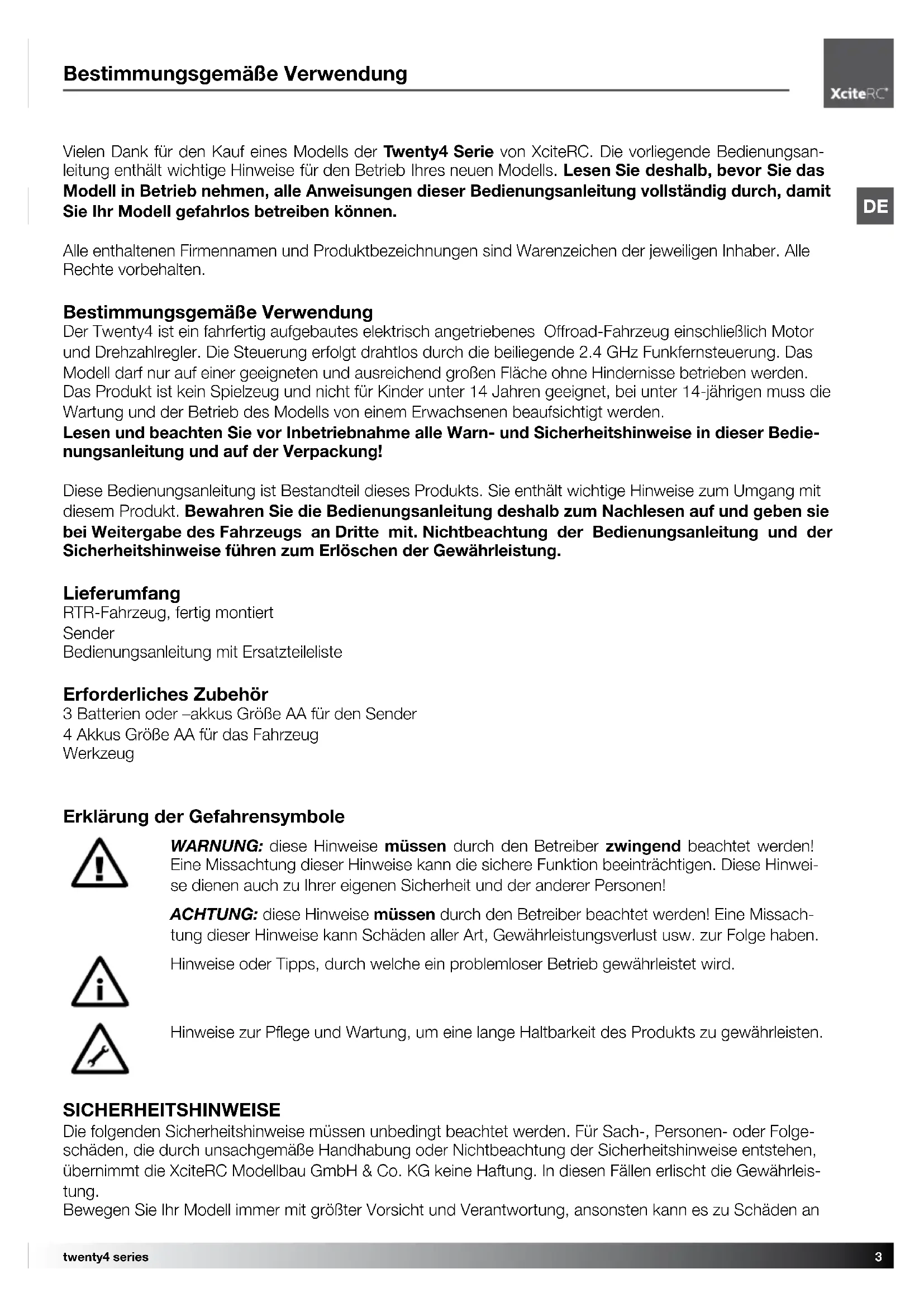 Bestimmungsgemäße Verwendung Vielen Dank für den Kauf eines Modells der Twenty4 Serie von XciteRC. Die vorliegende Bedienungsan- leitung enthält wichtige Hinweise für den Betrieb Ihres neuen Modells. Lesen Sie deshalb, bevor Sie das Modell in Betrieb nehmen, alle Anweisungen dieser Bedienungsanleitung vollständig durch, damit Sie Ihr Modell gefahrlos betreiben können. Alle enthaltenen Firmennamen und Produktbezeichnungen sind Warenzeichen der jeweiligen Inhaber. Alle Rechte vorbehalten. Bestimmungsgemäße Verwendung Der Twenty4 ist ein fahrfertig aufgebautes elektrisch angetriebenes Offroad-Fahrzeug einschließlich Motor und Drehzahlregler. Die Steuerung erfolgt drahtlos durch die beiliegende 2.4 GHz Funkfernsteuerung. Das Modell darf nur auf einer geeigneten und ausreichend großen Fläche ohne Hindernisse betrieben werden. Das Produkt ist kein Spielzeug und nicht für Kinder unter 14 Jahren geeignet, bei unter 14-jährigen muss die Wartung und der Betrieb des Modells von einem Erwachsenen beaufsichtigt werden. Lesen und beachten Sie vor Inbetriebnahme alle Warn- und Sicherheitshinweise in dieser Bedie- nungsanleitung und auf der Verpackung! Diese Bedienungsanleitung ist Bestandteil dieses Produkts. Sie enthält wichtige Hinweise zum Umgang mit diesem Produkt. Bewahren Sie die Bedienungsanleitung deshalb zum Nachlesen auf und geben sie bei Weitergabe des Fahrzeugs an Dritte mit. Nichtbeachtung der Bedienungsanleitung und der Sicherheitshinweise führen zum Erlöschen der Gewährleistung. Lieferumfang RTR-Fahrzeug, fertig montiert Sender Bedienungsanleitung mit Ersatzteileliste Erforderliches Zubehör 3 Batterien oder –akkus Größe AA für den Sender 4 Akkus Größe AA für das Fahrzeug Werkzeug Erklärung der Gefahrensymbole WARNUNG: diese Hinweise müssen durch den Betreiber zwingend beachtet werden! Eine Missachtung dieser Hinweise kann die sichere Funktion beeinträchtigen. Diese Hinwei- se dienen auch zu Ihrer eigenen Sicherheit und der anderer Personen! ACHTUNG: diese Hinweise müssen durch den Betreiber beachtet werden! Eine Missach- tung dieser Hinweise kann Schäden aller Art, Gewährleistungsverlust usw. zur Folge haben. Hinweise oder Tipps, durch welche ein problemloser Betrieb gewährleistet wird. Hinweise zur Pflege und Wartung, um eine lange Haltbarkeit des Produkts zu gewährleisten. SICHERHEITSHINWEISE Die folgenden Sicherheitshinweise müssen unbedingt beachtet werden. Für Sach-, Personen- oder Folge- schäden, die durch unsachgemäße Handhabung oder Nichtbeachtung der Sicherheitshinweise entstehen, übernimmt die XciteRC Modellbau GmbH & Co. KG keine Haftung. In diesen Fällen erlischt die Gewährleis- tung. Bewegen Sie Ihr Modell immer mit größter Vorsicht und Verantwortung, ansonsten kann es zu Schäden an4 twenty4 series