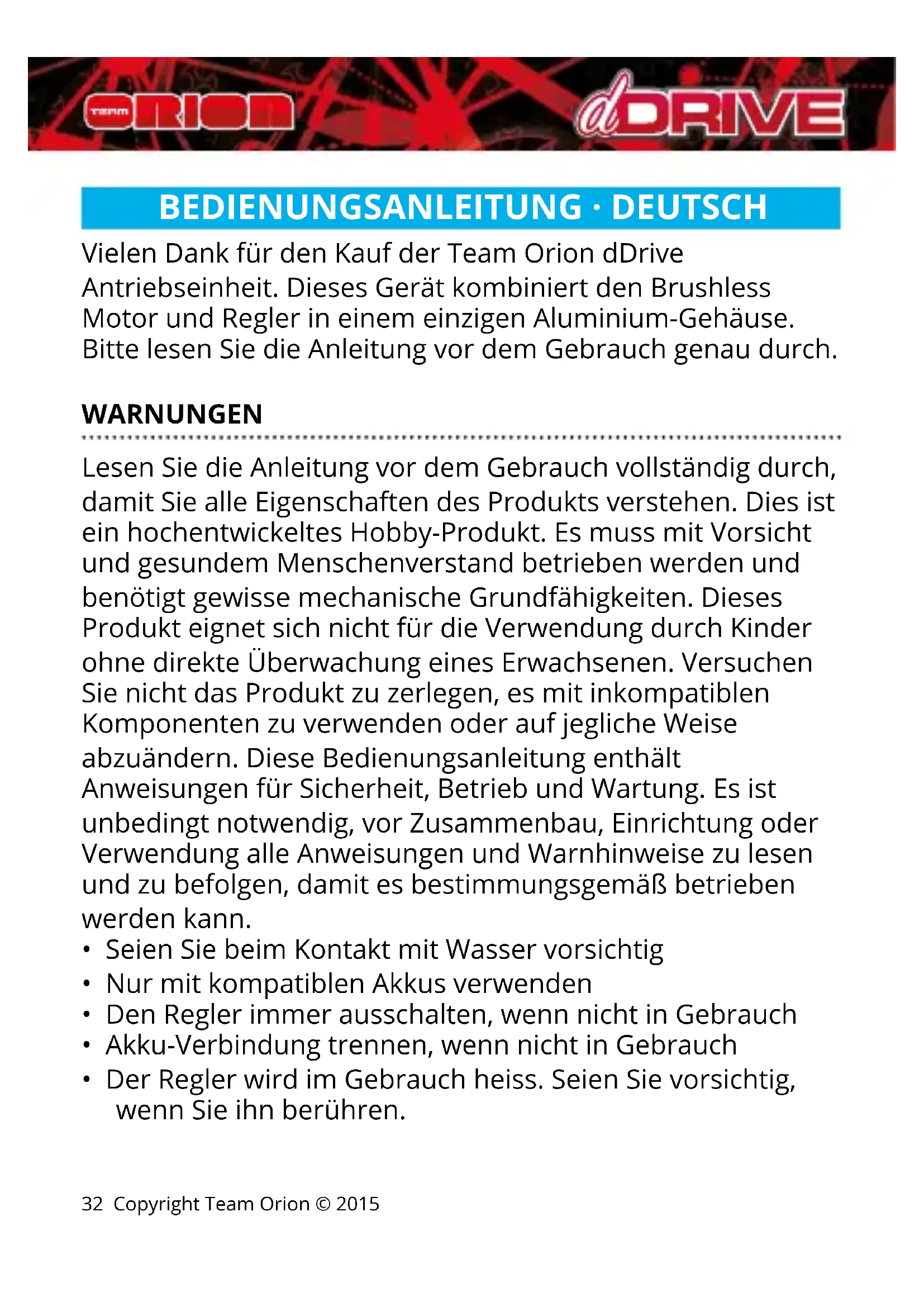Vielen Dank für den Kauf der Team Orion dDrive Antriebseinheit. Dieses Gerät kombiniert den Brushless Motor und Regler in einem einzigen Aluminium-Gehäuse. Bitte lesen Sie die Anleitung vor dem Gebrauch genau durch.