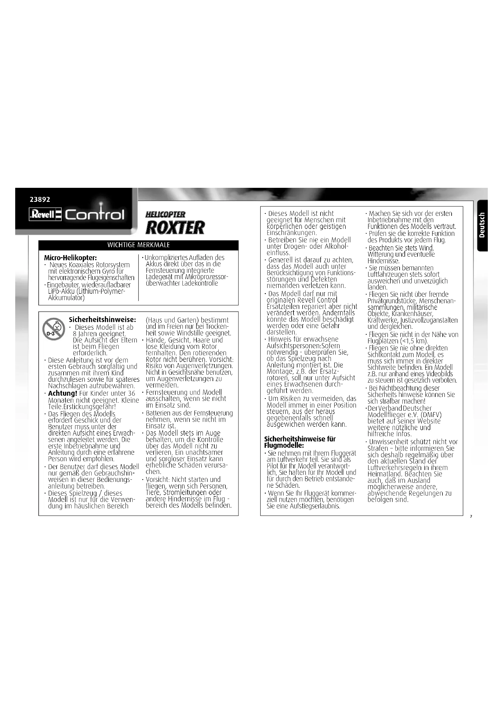 Das Modell darf nur mit originen Revell Control Ersatzeilen repariert aber nicht verandert werden. Andernfalls konnte das Modell beschadigt werden oder eine Gefahr darstellen.