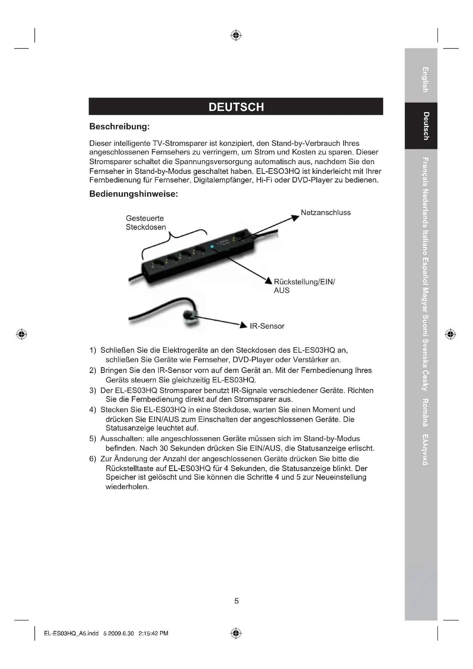 Spezikationen: Netzspannung: 230~240VAC• Frequenz: 50Hz• Max. Stromstärke: 16A• Max. Last: 3680W• Schalter: IR• Stecker/Eingang: Schuko• Ausgänge: 4• Stand-by-Verbrauch: <0,25W • Kabellänge: 1,5 m• Konformitätserklärung Wir, Nedis B.V., De Tweeling 28, 5215MC ’s-Hertogenbosch, Niederlande Tel.: 0031 73 599 1055, Email: info@nedis.com erklären, dass das Produkt: Marke: HQ Modell: EL-ES03HQ Beschreibung: TV SMART POWER SAVER den folgenden Normen entspricht: EN 61058-2-1:1993+A1:96+A11:02, EN 61058-1:2002+A2:08, EN 55014-1: 2006, EN 55014-2:1997/+A1:2001, EN 61000-3-2:2006, EN 61000-3-3(1995)/+A1:2001/+A2 :2005. und den Anforderungen der EG-Richtlinien 2004/108/EC und 2006/95/EC entspricht. ‘s-Hertogenbosch, 20.05.2009 J. Gilad Einkaufsleiterin EL-ES03HQ_A5.indd 6 2009.6.30 2:15:43 PMEnglish Deutsch Français Nederlands Italiano Español Magyar Suomi Svenska Česky Română Ελληνικά