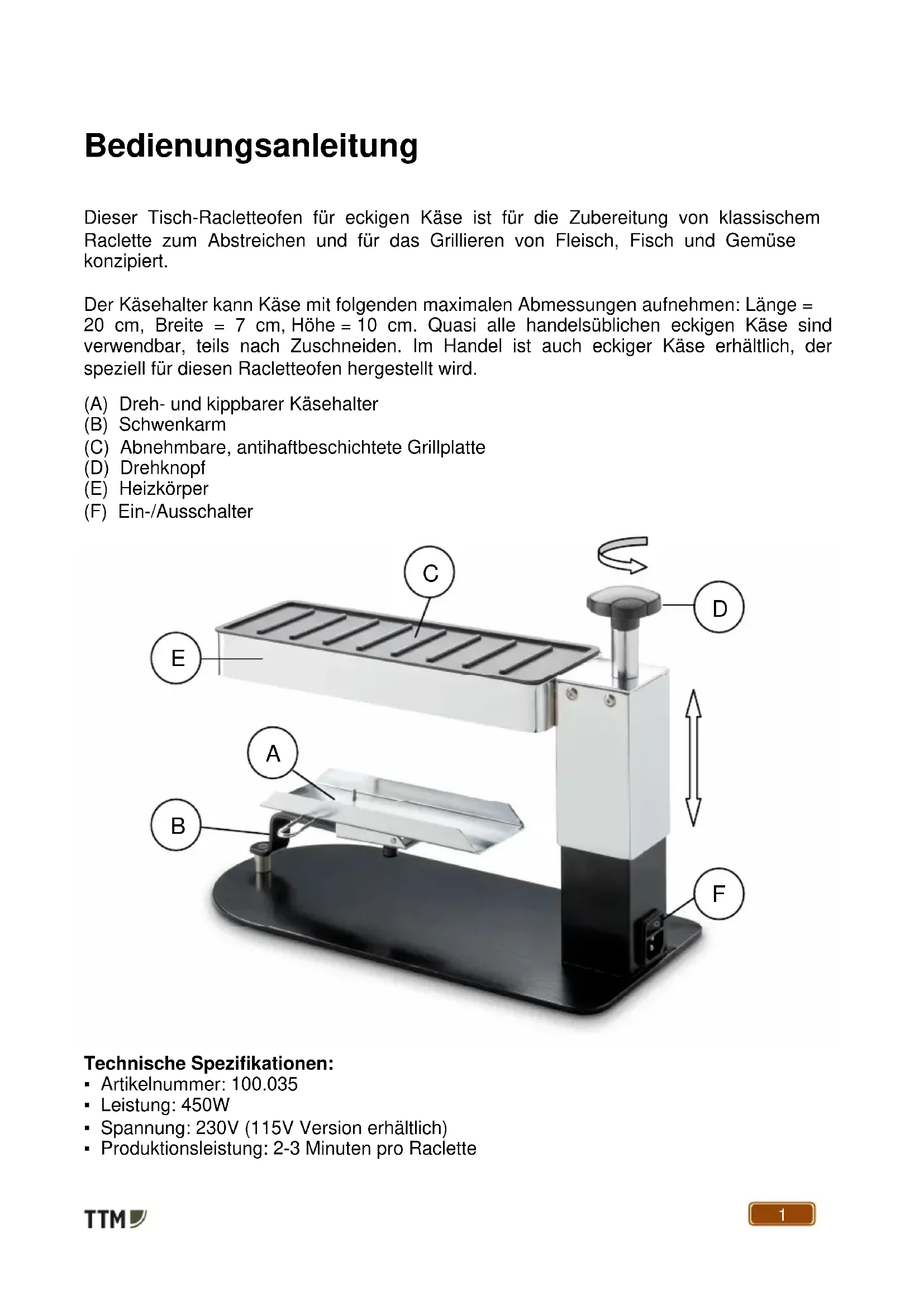 Laden Sie die Anleitung für Ihr Fondue-, Raclette- und Wokgerät kostenlos im PDF-Format! Finden Sie Ihr Handbuch Racl'Plus 100.035 - TTM und nehmen Sie Ihr elektronisches Gerät wieder in die Hand. Auf dieser Seite sind alle Dokumente veröffentlicht, die für die Verwendung Ihres Geräts notwendig sind. Racl'Plus 100.035 von der Marke TTM.