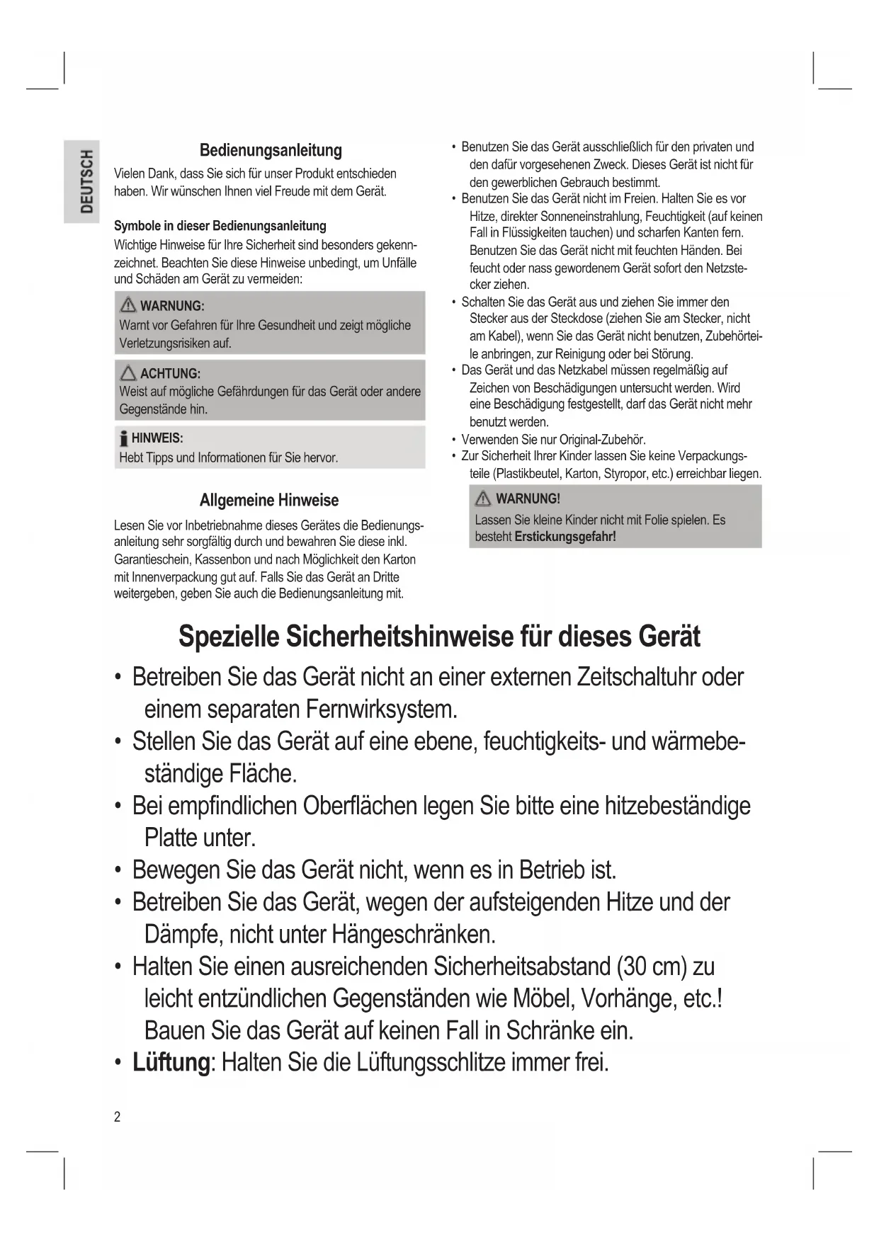 - Zur Sicherheit Ihrer Kinder lassen Sie keine Verpackungs- teile (Plastikbeutel, Karton, Styropor, etc.) erreichbar liegen. WARNUNG! Lassen Sie kleine Kinder nicht mit Folie spielen. Es besteht Erstickungsgefahr! Spezielle Sicherheitshinweise für dieses Gerät