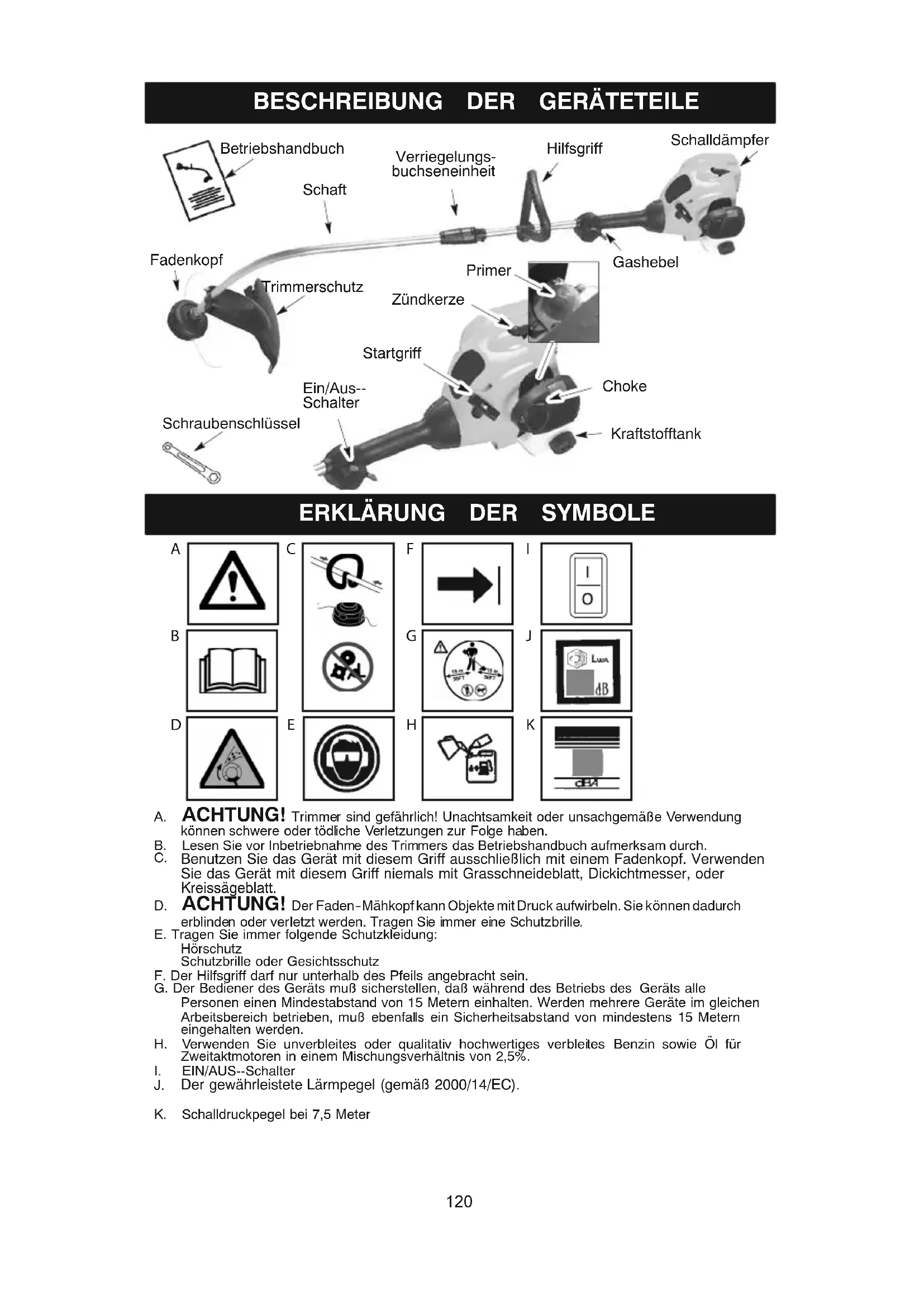 Benutzen Sie das Gerät mit diesem Griff ausschließlich mit einem Fadenkopf. Verwenden Sie das Gerät mit diesem Griff niemals mit Grasschneideblatt, Dickichtmesser, oder Kreissägeblatt. D. ACHTUNG! Der Faden--Mähkopf kann Objekte mit Druck aufwirbeln. Sie könnendadurch erblinden oder verletzt werden. Tragen Sie immer eine Schutzbrille. E. Tragen Sie immer folgende Schutzkleidung:HörschutzSchutzbrille oder GesichtsschutzF. Der Hilfsgriff darf nur unterhalb des Pfeils angebracht sein.G. Der Bediener des Geräts muß sicherstellen, daß während des Betriebs des Geräts allePersonen einen Mindestabstand von 15 Metern einhalten. Werden mehrere Geräte im gleichen Arbeitsbereich betrieben, muß ebenfalls ein Sicherheitsabstand von mindestens 15 Metern eingehalten werden. H. Verwenden Sie unverbleites oder qualitativ hochwertiges verbleites Benzin sowie Öl für Zweitaktmotoren in einem Mischungsverhältnis von 2,5%.I. EIN/AUS--Schalter