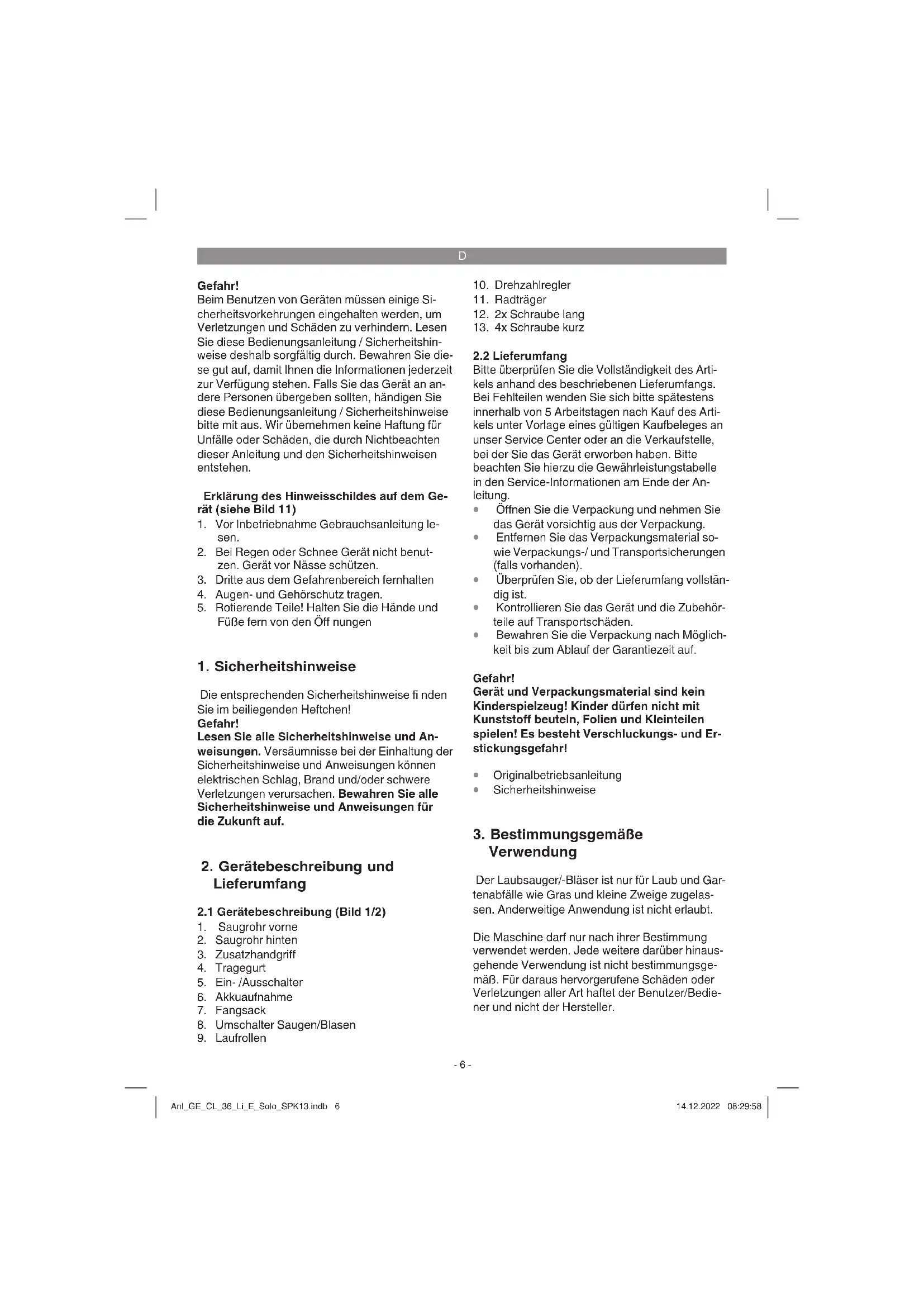 Verwendung Der Laubsauger/-Bläser ist nur für Laub und Gar- tenabfälle wie Gras und kleine Zweige zugelas- sen. Anderweitige Anwendung ist nicht erlaubt. Die Maschine darf nur nach ihrer Bestimmung verwendet werden. Jede weitere darüber hinaus- gehende Verwendung ist nicht bestimmungsge- mäß. Für daraus hervorgerufene Schäden oder Verletzungen aller Art haftet der Benutzer/Bedie- ner und nicht der Hersteller. Anl_GE_CL_36_Li_E_Solo_SPK13.indb 6Anl_GE_CL_36_Li_E_Solo_SPK13.indb 6 14.12.2022 08:29:5814.12.2022 08:29:58D