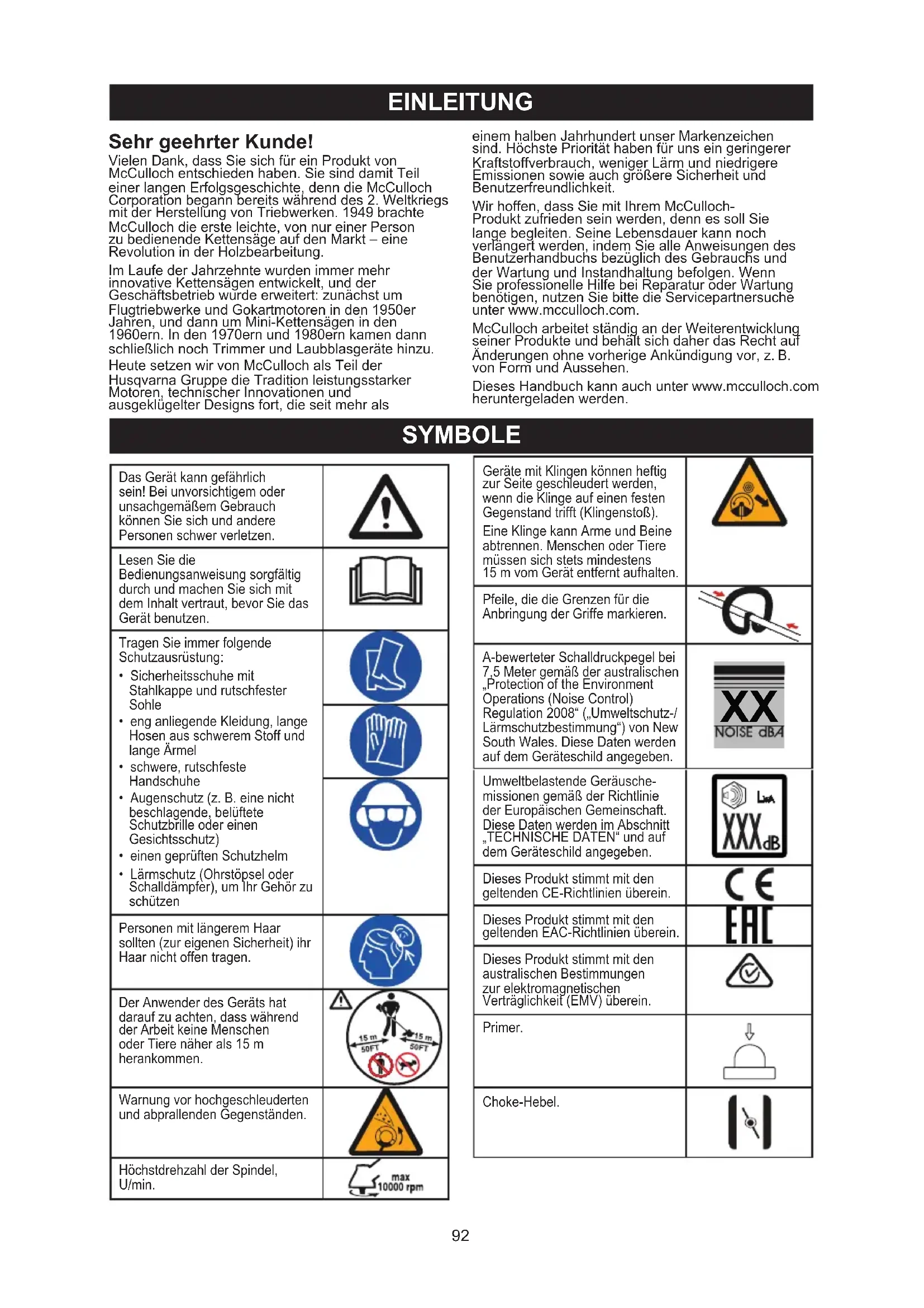 2006/42/EY koneita koskeva (2006-05-17) 2014/30/EU sähkömagneettista yhteensopivuutta koskeva (2014-02-26) 2000/14/EY melupäästöjä ympäristöön koskeva (2000-05-08)EINLEITUNG Sehr geehrter Kunde! Vielen Dank, dass Sie sich für ein Produkt von McCulloch entschieden haben. Sie sind damit Teil einer langen Erfolgsgeschichte, denn die McCulloch Corporation begann bereits während des 2. Weltkriegs mit der Herstellung von Triebwerken. 1949 brachte McCulloch die erste leichte, von nur einer Person zu bedienende Kettensäge auf den Markt – eine Revolution in der Holzbearbeitung. Im Laufe der Jahrzehnte wurden immer mehr innovative Kettensägen entwickelt, und der Geschäftsbetrieb wurde erweitert: zunächst um Flugtriebwerke und Gokartmotoren in den 1950er Jahren, und dann um Mini-Kettensägen in den 1960ern. In den 1970ern und 1980ern kamen dann schließlich noch Trimmer und Laubblasgeräte hinzu. Heute setzen wir von McCulloch als Teil der Husqvarna Gruppe die Tradition leistungsstarker Motoren, technischer Innovationen und ausgeklügelter Designs fort, die seit mehr als einem halben Jahrhundert unser Markenzeichen sind. Höchste Priorität haben für uns ein geringerer Kraftstoffverbrauch, weniger Lärm und niedrigere Emissionen sowie auch größere Sicherheit und Benutzerfreundlichkeit. Wir hoffen, dass Sie mit Ihrem McCulloch- Produkt zufrieden sein werden, denn es soll Sie lange begleiten. Seine Lebensdauer kann noch verlängert werden, indem Sie alle Anweisungen des Benutzerhandbuchs bezüglich des Gebrauchs und der Wartung und Instandhaltung befolgen. Wenn Sie professionelle Hilfe bei Reparatur oder Wartung benötigen, nutzen Sie bitte die Servicepartnersuche unter www.mcculloch.com. McCulloch arbeitet ständig an der Weiterentwicklung seiner Produkte und behält sich daher das Recht auf Änderungen ohne vorherige Ankündigung vor, z.