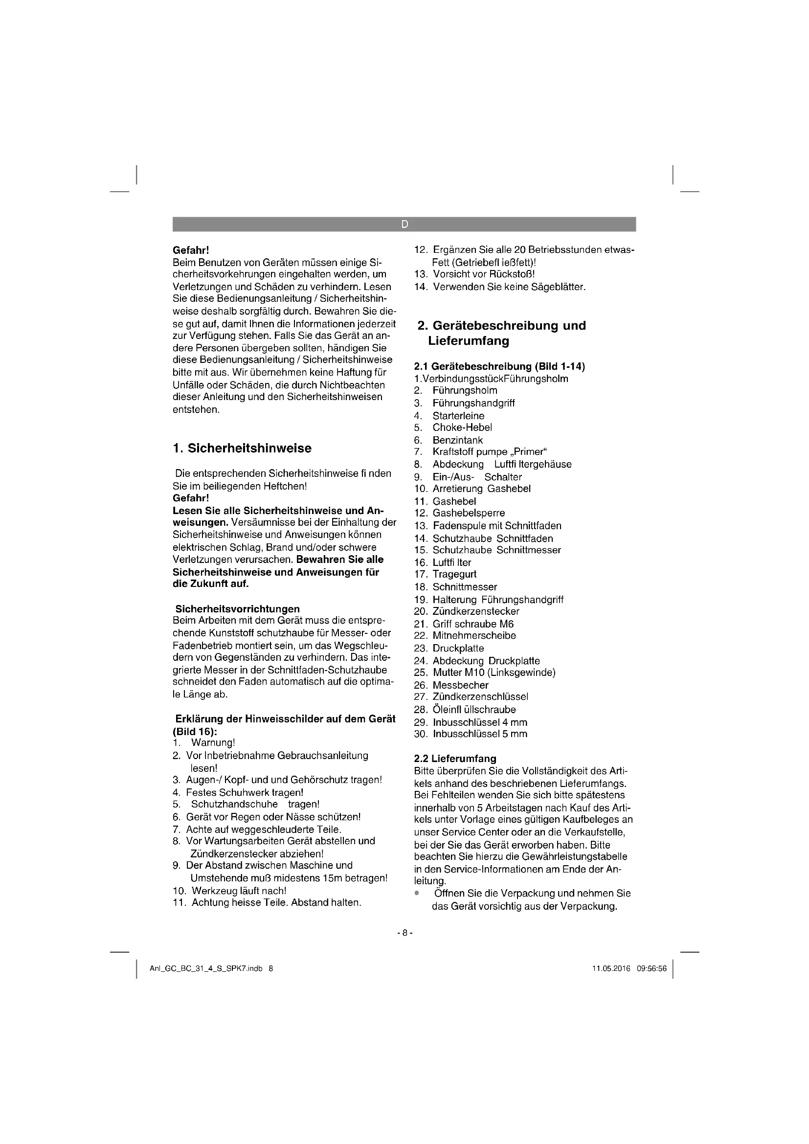 Wiederverwertung Das Gerät befi ndet sich in einer Verpackung um Transportschäden zu verhindern. Diese Verpa- ckung ist Rohstoff und ist somit wieder verwend- bar oder kann dem Rohstoff kreislauf zurückge- führt werden. Das Gerät und dessen Zubehör bestehen aus verschiedenen Materialien, wie z.B. Metall und Kunststoff e. Defekte Geräte ge- hören nicht in den Hausmüll. Zur fachgerechten Entsorgung sollte das Gerät an einer geeigneten Sammelstellen abgegeben werden. Wenn Ihnen keine Sammelstelle bekannt ist, sollten Sie bei der Gemeindeverwaltung nachfragen. Anl_GC_BC_31_4_S_SPK7.indb 15Anl_GC_BC_31_4_S_SPK7.indb 15 11.05.2016 09:56:5711.05.2016 09:56:57D