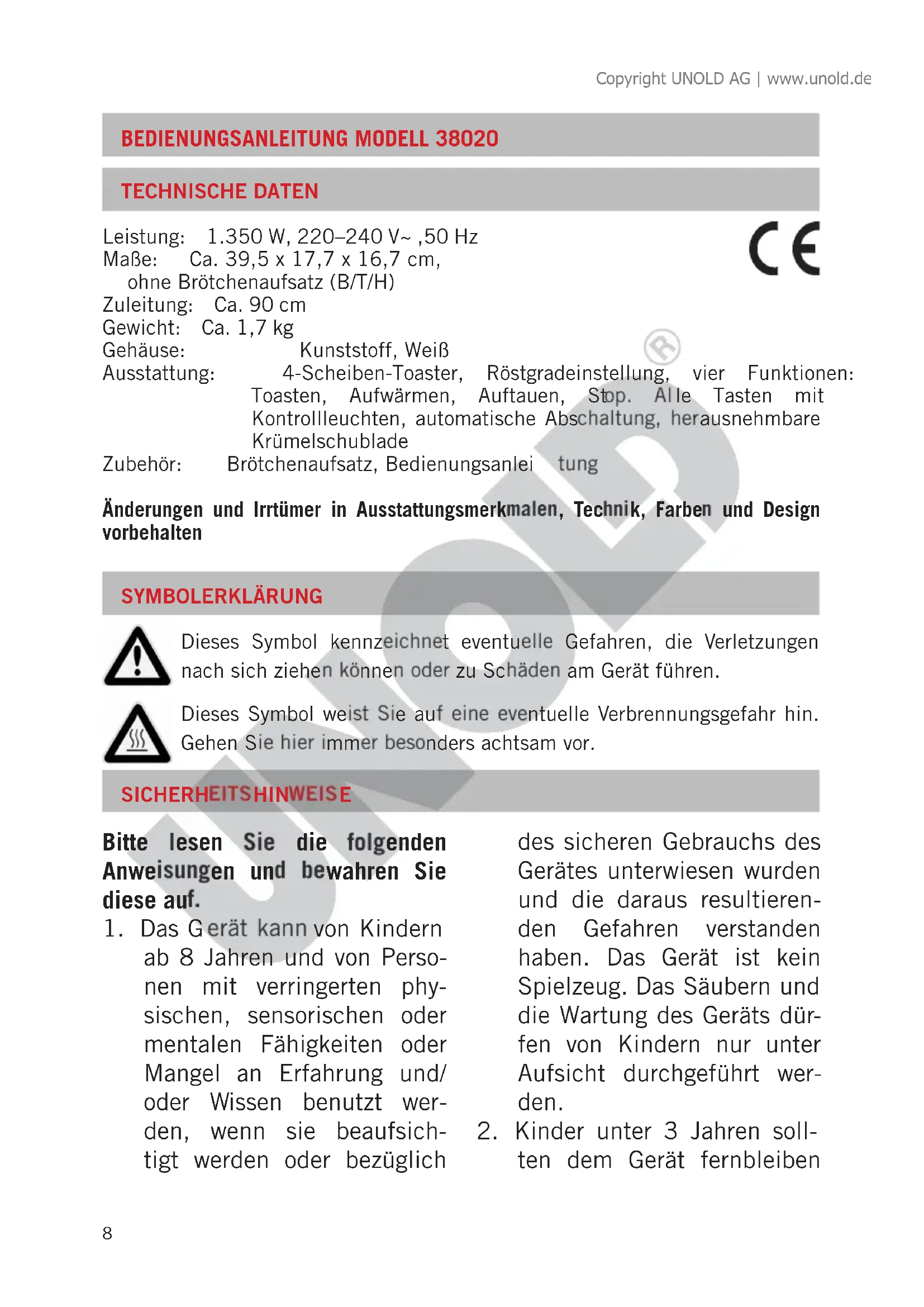 Kinder unter 3 Jahren soll- ten dem Gerät fernbleiben SYMBOLERKLÄRUNG Dieses Symbol kennzeichnet eventuelle Gefahren, die Verletzungen nach sich ziehen können oder zu Schäden am Gerät führen. Dieses Symbol weist Sie auf eine eventuelle Verbrennungsgefahr hin. Gehen Sie hier immer besonders achtsam vor. Leistung: 1.350 W, 220–240 V~ ,50 Hz Maße: Ca. 39,5 x 17,7 x 16,7 cm, ohne Brötchenaufsatz (B/T/H) Zuleitung: Ca. 90 cm Gewicht: Ca. 1,7 kg Gehäuse: Kunststoff, Weiß Ausstattung: 4-Scheiben-Toaster, Röstgradeinstellung, vier Funktionen: Toasten, Aufwärmen, Auftauen, Stop. Alle Tasten mit Kontrollleuchten, automatische Abschaltung, herausnehmbare Krümelschublade Zubehör: Brötchenaufsatz, Bedienungsanleitung Änderungen und Irrtümer in Ausstattungsmerkmalen, Technik, Farben und Design vorbehalten Copyright UNOLD AG | www.unold.de9 oder durchgehend beauf- sichtigt werden.