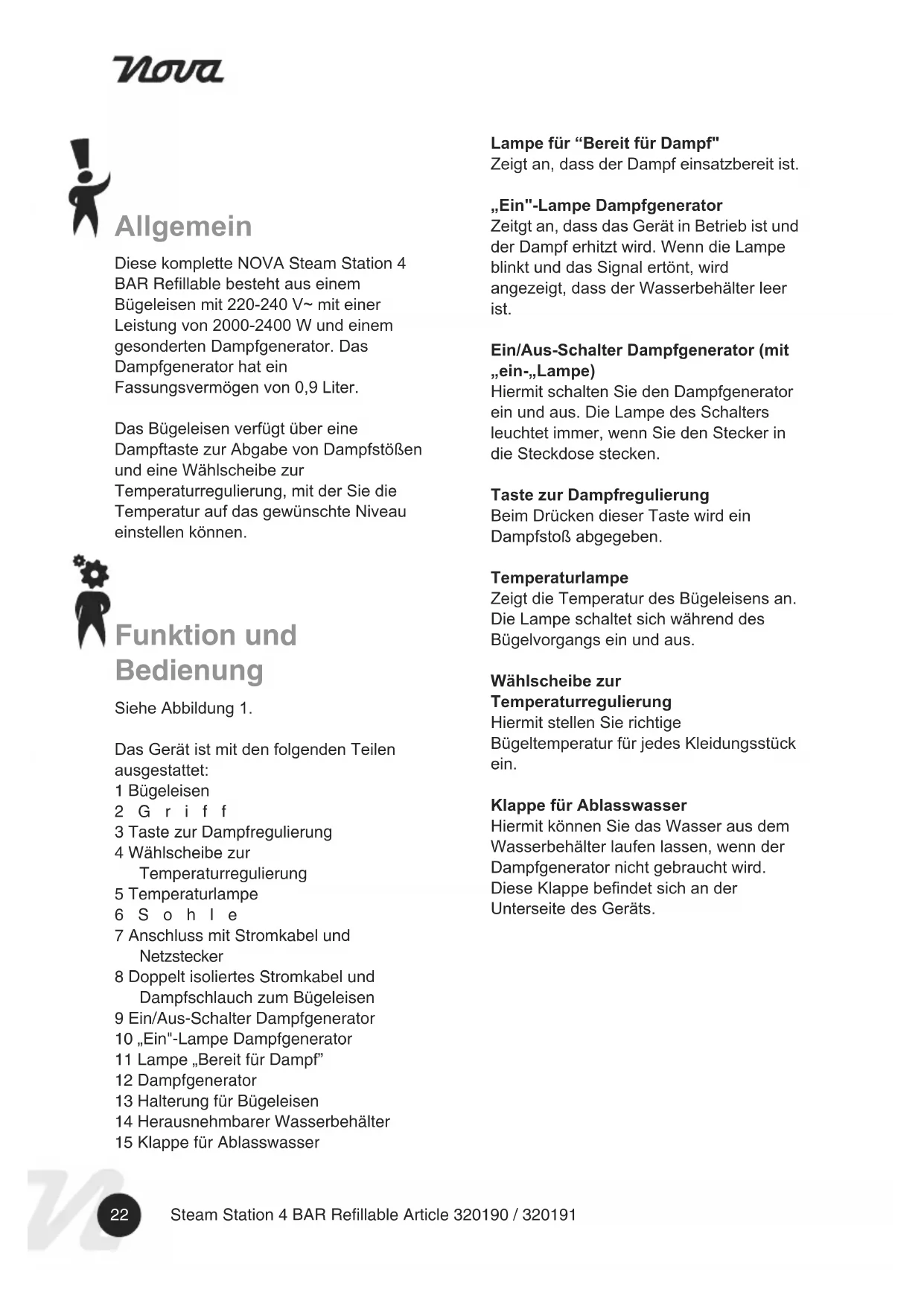 - 2002/96/EC22 Steam Station 4 BAR Refillable Article 320190 / 320191 Allgemein Diese komplette NOVA Steam Station 4 BAR Refillable besteht aus einem Bügeleisen mit 220-240 V~ mit einer Leistung von 2000-2400 W und einem gesonderten Dampfgenerator. Das Dampfgenerator hat ein Fassungsvermögen von 0,9 Liter. Das Bügeleisen verfügt über eine Dampftaste zur Abgabe von Dampfstößen und eine Wählscheibe zur Temperaturregulierung, mit der Sie die Temperatur auf das gewünschte Niveau einstellen können. Funktion und Bedienung Siehe Abbildung 1. Das Gerät ist mit den folgenden Teilen ausgestattet: 1 Bügeleisen 2Griff 3 Taste zur Dampfregulierung 4 Wählscheibe zur Temperaturregulierung 5 Temperaturlampe 6Sohle 7 Anschluss mit Stromkabel und Netzstecker 8 Doppelt isoliertes Stromkabel und Dampfschlauch zum Bügeleisen 9 Ein/Aus-Schalter Dampfgenerator 10 „Ein"-Lampe Dampfgenerator 11 Lampe „Bereit für Dampf” 12 Dampfgenerator 13 Halterung für Bügeleisen 14 Herausnehmbarer Wasserbehälter 15 Klappe für Ablasswasser Lampe für “Bereit für Dampf" Zeigt an, dass der Dampf einsatzbereit ist. „Ein"-Lampe Dampfgenerator Zeitgt an, dass das Gerät in Betrieb ist und der Dampf erhitzt wird. Wenn die Lampe blinkt und das Signal ertönt, wird angezeigt, dass der Wasserbehälter leer ist. Ein/Aus-Schalter Dampfgenerator (mit „ein-„Lampe) Hiermit schalten Sie den Dampfgenerator ein und aus. Die Lampe des Schalters leuchtet immer, wenn Sie den Stecker in die Steckdose stecken. Taste zur Dampfregulierung Beim Drücken dieser Taste wird ein Dampfstoß abgegeben. Temperaturlampe Zeigt die Temperatur des Bügeleisens an. Die Lampe schaltet sich während des Bügelvorgangs ein und aus. Wählscheibe zur Temperaturregulierung Hiermit stellen Sie richtige Bügeltemperatur für jedes Kleidungsstück ein. Klappe für Ablasswasser Hiermit können Sie das Wasser aus dem Wasserbehälter laufen lassen, wenn der Dampfgenerator nicht gebraucht wird. Diese Klappe befindet sich an der Unterseite des Geräts.23 Steam Station 4 BAR Refillable Article 320190 / 320191 Vor der ersten Verwendung