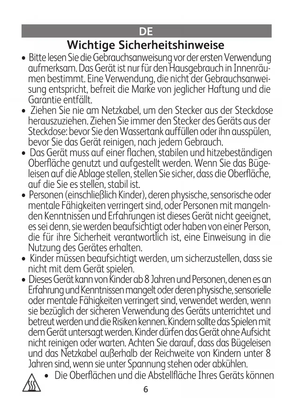 - Dieses Gerät kann von Kinder ab 8 Jahren und Personen, denen es an Erfahrung und Kenntnissen mangelt oder deren physische, sensorielle oder mentale Fähigkeiten verringert sind, verwendet werden, wenn sie bezüglich der sicheren Verwendung des Geräts unterrichtet und betreut werden und die Risiken kennen. Kindern sollte das Spielen mit dem Gerät untersagt werden. Kinder dürfen das Gerät ohne Aufsicht nicht reinigen oder warten. Achten Sie darauf, dass das Bügeleisen und das Netzkabel außerhalb der Reichweite von Kindern unter 8 Jahren sind, wenn sie unter Spannung stehen oder abkühlen.