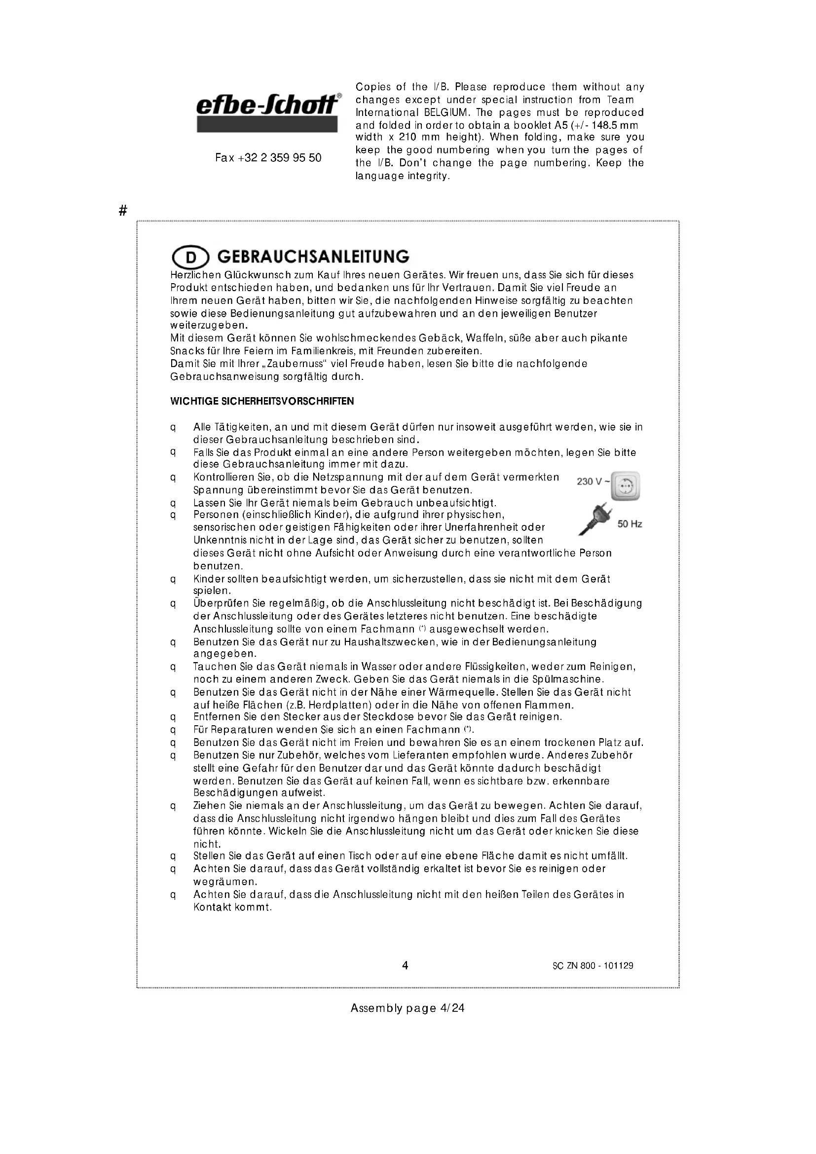 SC ZN 800 - 101129 Assembly page 4/24 Fax +32 2 359 95 50 Herzlichen Glückwunsch zum Kauf Ihres neuen Gerätes. Wir freuen uns, dass Sie sich für dieses Produkt entschieden haben, und bedanken uns für Ihr Vertrauen. Damit Sie viel Freude an Ihrem neuen Gerät haben, bitten wir Sie, die nachfolgenden Hinweise sorgfältig zu beachten sowie diese Bedienungsanleitung gut aufzubewahren und an den jeweiligen Benutzer weiterzugeben. Mit diesem Gerät können Sie wohlschmeckendes Gebäck, Waffeln, süße aber auch pikante Snacks für Ihre Feiern im Familienkreis, mit Freunden zubereiten. Damit Sie mit Ihrer „Zaubernuss“ viel Freude haben, lesen Sie bitte die nachfolgende Gebrauchsanweisung sorgfältig durch. WICHTIGE SICHERHEITSVORSCHRIFTEN