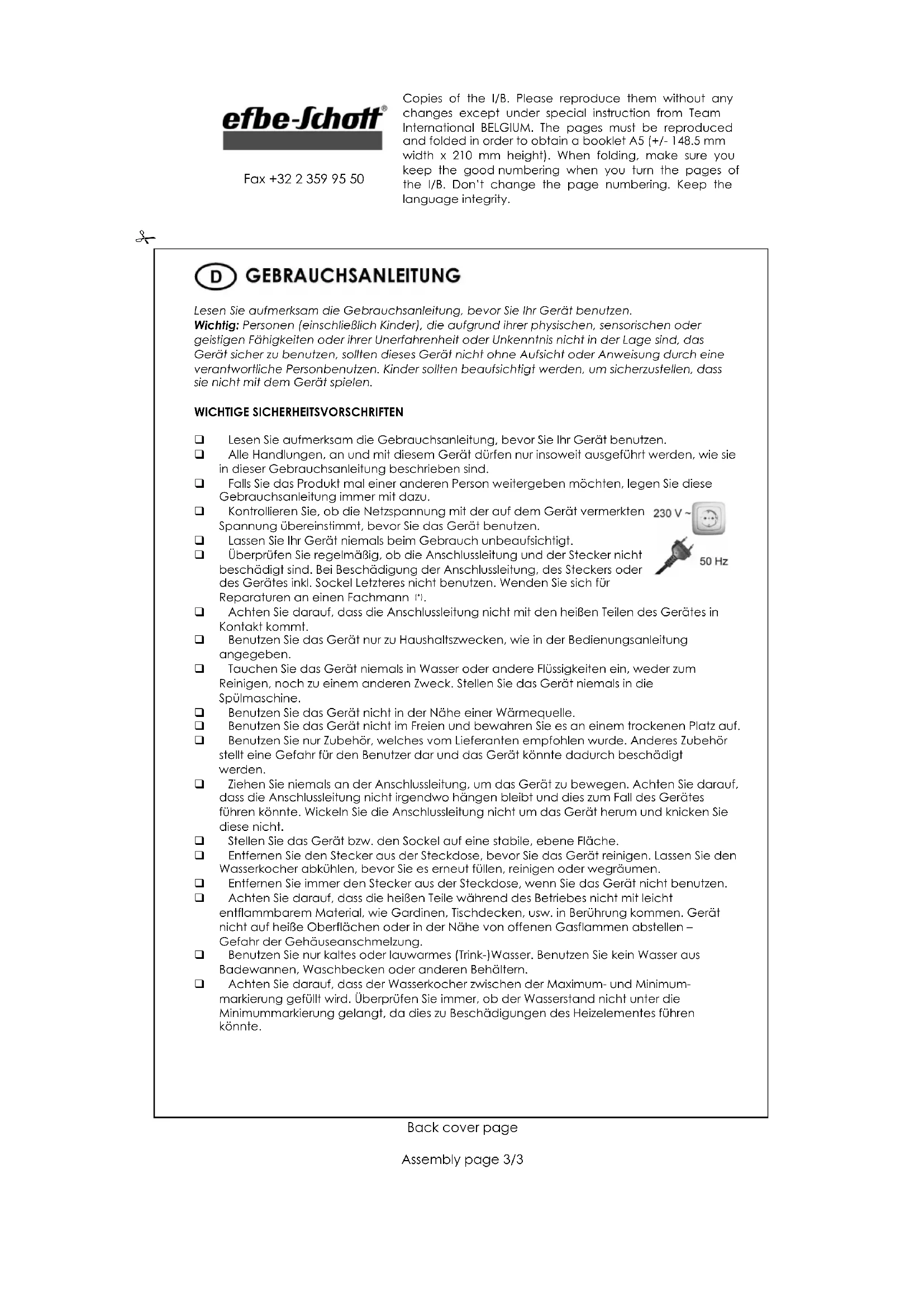 Fax +32 2 359 95 50 Während des Erhitzungsvorganges des Wassers sollte der Deckel sachgemäß geschlossen sein. Berühren Sie die heißen Teile nicht, sondern benutzen Sie den Griff. Achtung! Wenn Sie zuviel Wasser einfüllen, kann der Wasserkocher überkochen und kochendes Wasser kann herausspritzen. Achten Sie darauf, dass Sie sich nicht verbrennen, da beim Kochvorgang heißer Dampf entweichen kann. Lassen Sie den Wasserkocher abkühlen, bevor Sie ihn erneut füllen oder reinigen. Benutzen Sie zum Entkalken ausschließlich hierfür vorgesehene Produkte. Benutzen Sie niemals Ammoniak oder andere Produkte, die Ihrer Gesundheit schaden könnten. Benutzen Sie den Wasserkocher nur mit dem dazugehörigen Sockel.