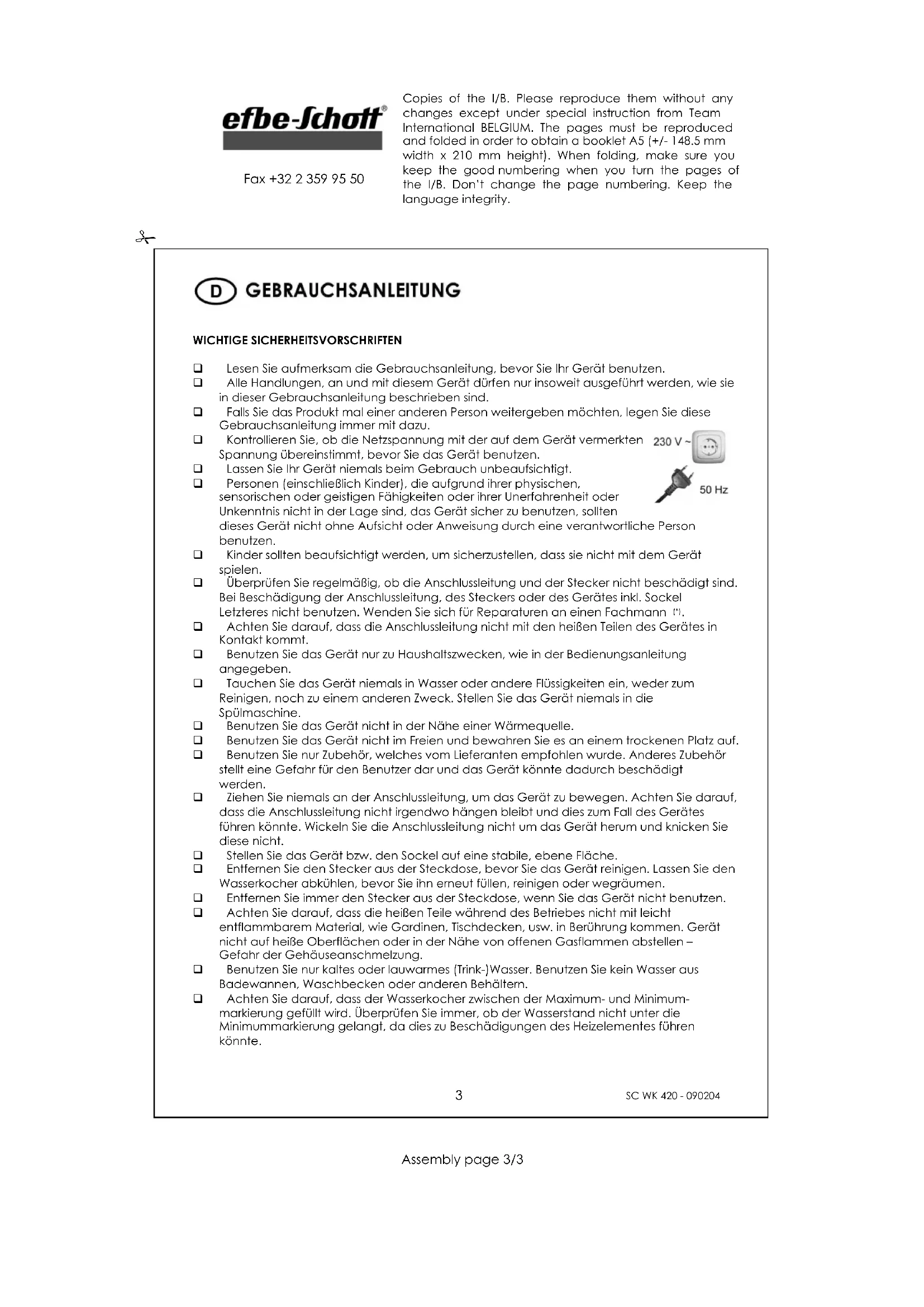 Fax +32 2 359 95 50 Während des Erhitzungsvorganges des Wassers sollte der Deckel sachgemäß geschlossen sein. Berühren Sie die heißen Teile nicht, sondern benutzen Sie den Griff. Achtung! Wenn Sie zuviel Wasser einfüllen, kann der Wasserkocher überkochen und kochendes Wasser kann herausspritzen. Achten Sie darauf, dass Sie sich nicht verbrennen, da beim Kochvorgang heißer Dampf entweichen kann. Lassen Sie den Wasserkocher abkühlen, bevor Sie ihn erneut füllen oder reinigen. Benutzen Sie zum Entkalken ausschließlich hierfür vorgesehene Produkte. Benutzen Sie niemals Ammoniak oder andere Produkte, die Ihrer Gesundheit schaden könnten. Benutzen Sie den Wasserkocher nur mit dem dazugehörigen Sockel.