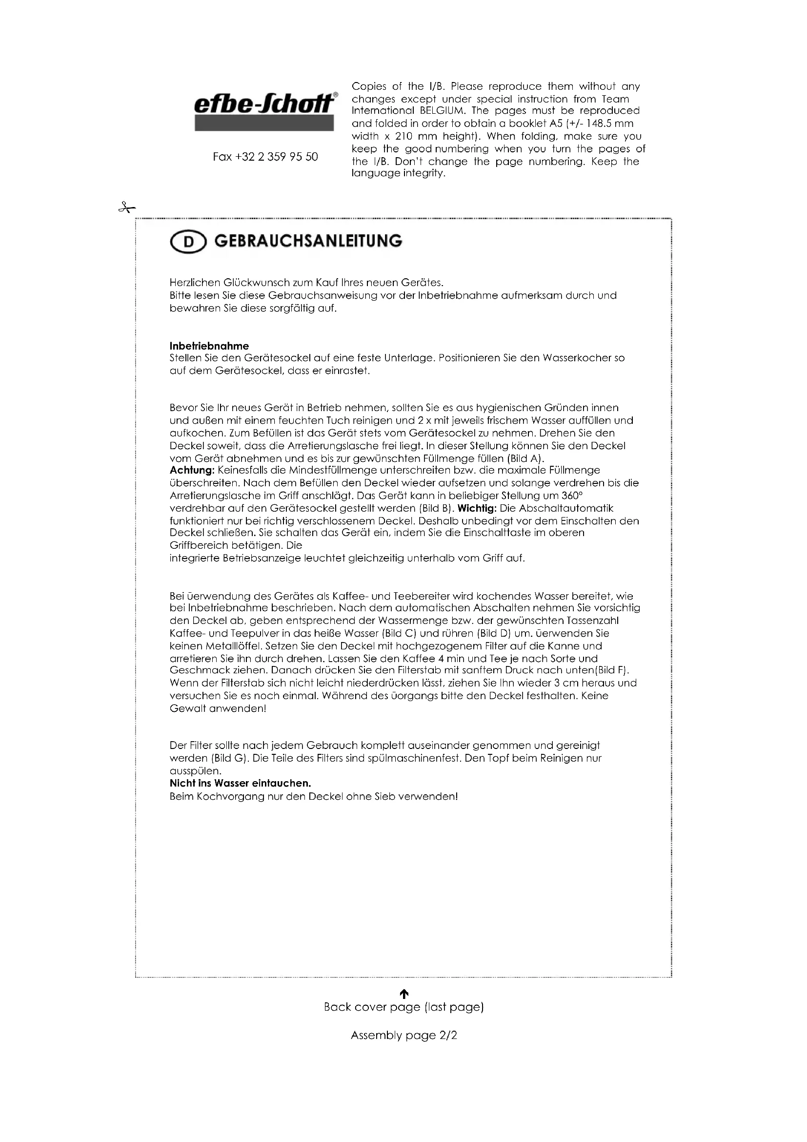 - Benutzen Sie das Gerät ausschließlich zum Erhitzen von Wasser! Niemals Milch, Brühe oder andere aufschäumende Getränke erhitzen! Bei unsachgemäßem Gebrauch oder falscher Bedienung kann keine Haftung übernommen werden.