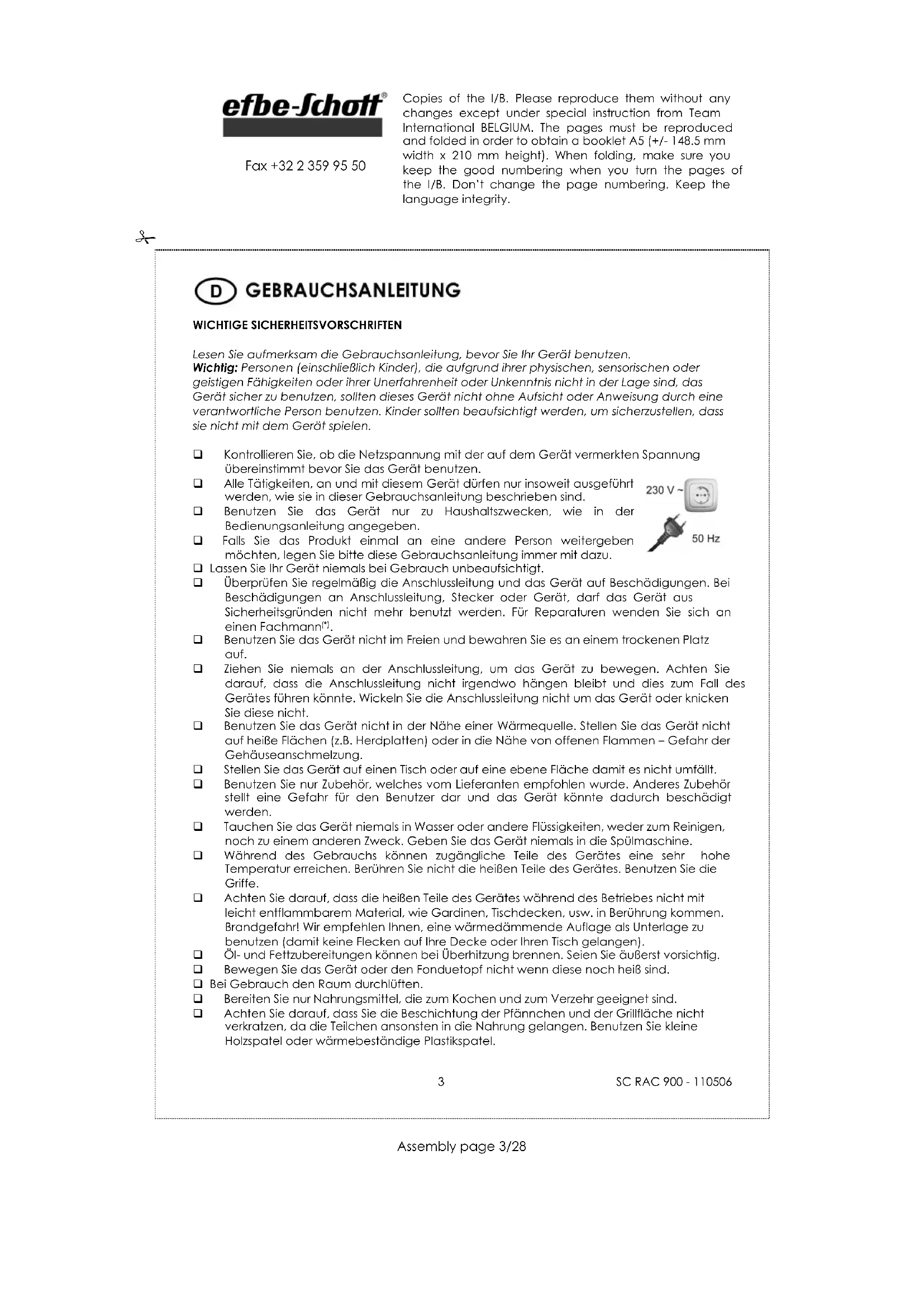 Fax +32 2 359 95 50 ACHTUNG: Benutzen Sie das Gerät nicht länger als eine Stunde bei maximaler Temperatur ohne Pause! Regeln Sie die Heizphasen durch Regulierung am Regler.