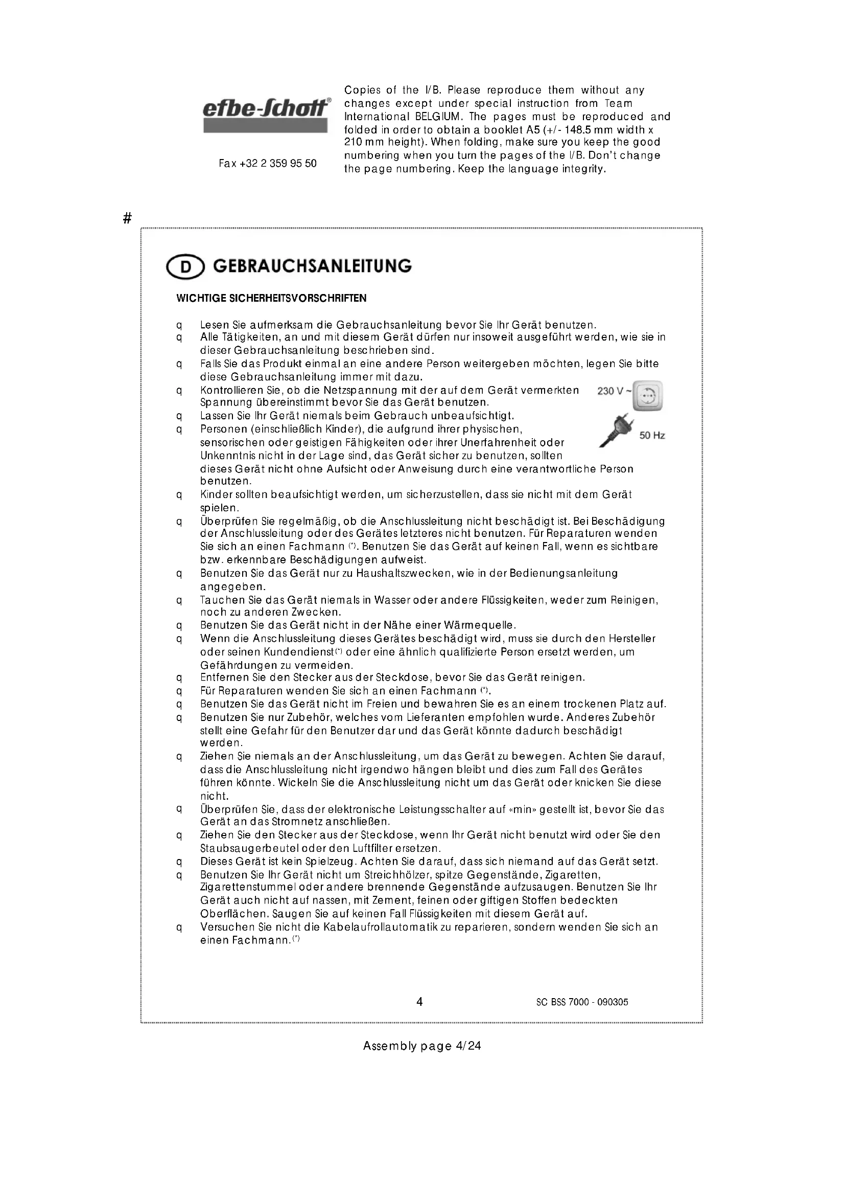 Assembly page 8/24 Fax +32 2 359 95 50 Gewährleistungs- und Garantiebedingungen Für unsere Produkte gelten die gesetzlichen Bestimmungen für Gewährleistungsansprüche. Innerhalb dieser Zeit werden Mängel, welche auf Material- oder Herstellungsfehlern beruhen, behoben. Davon ausgeschlossen sind Beschädigungen an zerbrechlichen Teilen, Schäden, die durch übermäßige Beanspruchung, unsachgemäße Behandlung und Wartung sowie durch Nichtbeachtung der Gebrauchsanweisung entstehen, Schäden, welche durch Verschleiß oder infolge normaler Abnützung entstanden sind. Ebenso weisen wir darauf hin, dass die Gewährleistung bei Fremdeingriff erlischt. Hierbei wird der Verkäufer im Fall eines Schadens keine Haftung übernehmen. Sollten Sie einen Mangel feststellen, geben Sie bitte das vollständige Gerät an ihren Händler bzw. Verkaufsstelle. Gewährleistungsansprüche gelten nur in Verbindung mit dem zugehörigen Kassenbon bzw. der Kopie einer eventuellen Reparaturrechnung, die bei Inanspruchnahme der Serviceleistung unbedingt mit vorzulegen sind/ist. Sie haben auch die Möglichkeit, das gesäuberte Gerät mit einer kurzen, gut lesbaren Fehlerbeschreibung zusammen mit dem Kassenbon in einer frankierten Sendung an unseren Kundendienst in unserer Firma in Bad Blankenburg zu senden. Defekte Zubehörteile führen nicht zum Umtausch des Gerätes, sondern werden kostenlos im Austausch zugesandt. In diesem Fall bitte nicht das Gerät einschicken, sondern nur das defekte Zubehörteil bestellen! Glasbruchschäden sind grundsätzlich kostenpflichtig. Sowohl Defekte an Verbrauchszubehör bzw. Verschleißteilen, als auch Reinigung, Wartung oder der Austausch von Verschleißteilen (Teleskoprohr, Saugschlauch, Bodendüse und evtl. Dauerfilter), fallen nicht unter die Gewährleistung und sind deshalb kostenpflichtig! Nach Ablauf der Gesetzlichen Gewährleistungsfrist Reparaturen können kostenpflichtig von entsprechendem Fachpersonal oder Reparaturservice ausgeführt werden.# Copies of the I/B. Please reproduce them without any changes except under special instruction from Team International BELGIUM. The pages must be reproduced and folded in order to obtain a booklet A5 (+/- 148.5 mm width x 210 mm height). When folding, make sure you keep the good numbering when you turn the pages of the I/B. Don’t change the page numbering. Keep the language integrity.