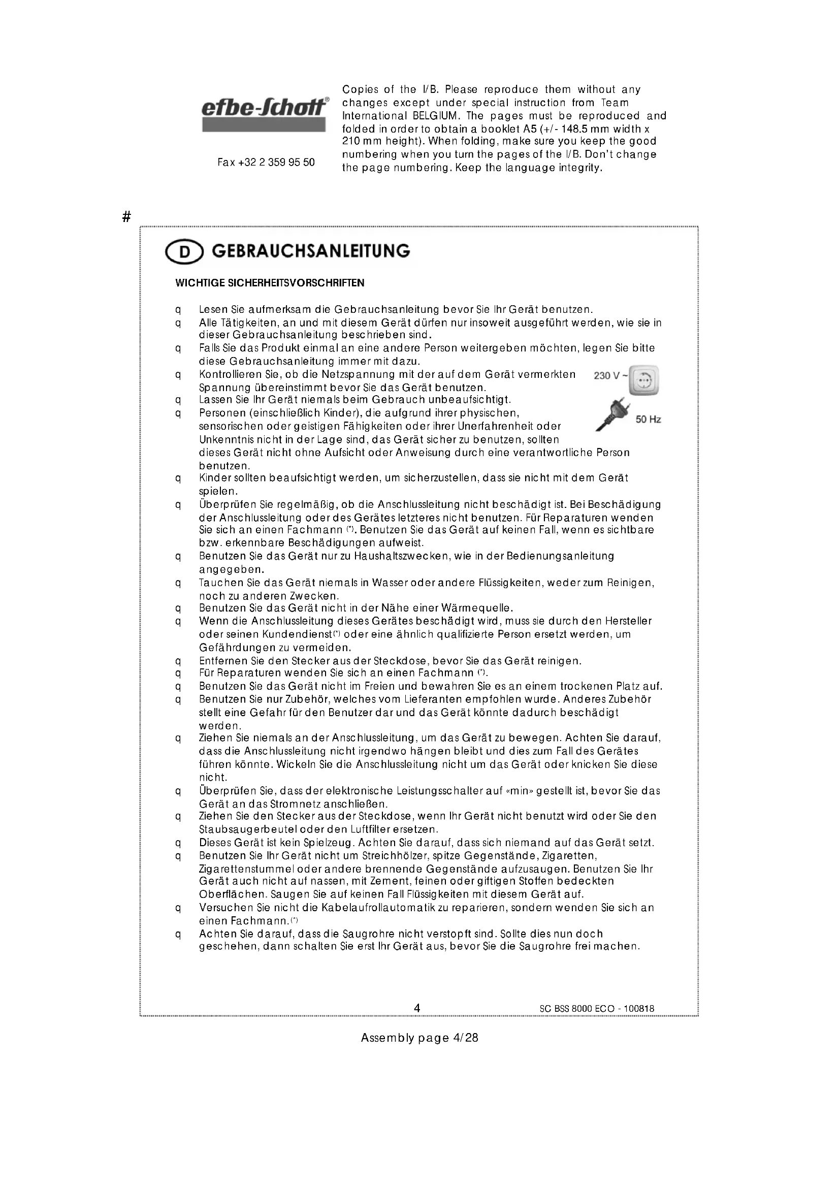 Für unsere Produkte gelten die gesetzlichen Bestimmungen für Gewährleistungsansprüche. Innerhalb dieser Zeit werden Mängel, welche auf Material- oder Herstellungsfehlern beruhen, behoben. Davon ausgeschlossen sind Beschädigungen an zerbrechlichen Teilen, Schäden, die durch übermäßige Beanspruchung, unsachgemäße Behandlung und Wartung sowie durch Nichtbeachtung der Gebrauchsanweisung entstehen, Schäden, welche durch Verschleiß oder infolge normaler Abnützung entstanden sind. Ebenso weisen wir darauf hin, dass die Gewährleistung bei Fremdeingriff erlischt. Hierbei wird der Verkäufer im Fall eines Schadens keine Haftung übernehmen. Sollten Sie einen Mangel feststellen, geben Sie bitte das vollständige Gerät an ihren Händler bzw. Verkaufsstelle. Gewährleistungsansprüche gelten nur in Verbindung mit dem zugehörigen Kassenbon bzw. der Kopie einer eventuellen Reparaturrechnung, die bei Inanspruchnahme der Serviceleistung unbedingt mit vorzulegen sind/ist. Sie haben auch die Möglichkeit, das gesäuberte Gerät mit einer kurzen, gut lesbaren Fehlerbeschreibung zusammen mit dem Kassenbon in einer frankierten Sendung an unseren Kundendienst in unserer Firma in Bad Blankenburg zu senden. Defekte Zubehörteile führen nicht zum Umtausch des Gerätes, sondern werden kostenlos im Austausch zugesandt. In diesem Fall bitte nicht das Gerät einschicken, sondern nur das defekte Zubehörteil bestellen! Sowohl Defekte an Verbrauchszubehör bzw. Verschleißteilen, als auch Reinigung, Wartung oder der Austausch von Verschleißteilen ( Teleskoprohr, Saugschlauch, Bodendüse und evtl. Dauerfilter ), fallen nicht unter die Gewährleistung und sind deshalb kostenpflichtig! Nach Ablauf der Gesetzlichen Gewährleistungsfrist Reparaturen können kostenpflichtig von entsprechendem Fachpersonal oder Reparaturservice ausgeführt werden.# Copies of the I/B. Please reproduce them without any changes except under special instruction from Team International BELGIUM. The pages must be reproduced and folded in order to obtain a booklet A5 (+/- 148.5 mm width x 210 mm height). When folding, make sure you keep the good numbering when you turn the pages of the I/B. Don’t change the page numbering. Keep the language integrity.
