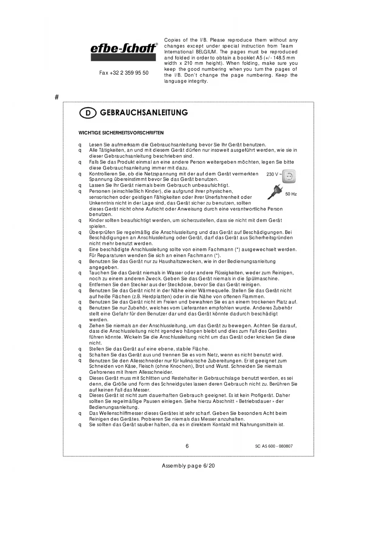 Zum Schutz unserer Umwelt und unserer Gesundheit sind Elektro- und Elektronik-Altgeräte nach bestimmten Regeln zu entsorgen. Dies fordert den Einsatz sowohl des Herstellers bzw. Lieferanten als auch des Verbrauchers. Aus diesem Grund darf dieses Gerät, wie das Symbol auf dem Typenschild bzw. auf der Verpackung zeigt, nicht in den unsortierten Restmüll gegeben werden. Der Verbraucher hat das Recht, dieses Gerät kostenfrei über kommunale Sammelstellen zu entsorgen; von dort aus wird die spezifische Behandlung, Verwertung bzw. das Recycling gem. den Erfordernissen der Richtlinie sichergestellt. KUNDENDIENST efbe Elektrogeräte GmbH Gustav-Töpfer-Straße 6 07422 Bad Blankenburg / Thüringen Deutschland Tel : Deutschland 036741 70268 / 70266 International 0049 36741 70268 / 70266 Fax: Deutschland 036741 70273 International 0049 36741 70273 Bei Fragen kontaktieren Sie bitte unseren Kundendienst.# Copies of the I/B. Please reproduce them without any changes except under special instruction from Team International BELGIUM. The pages must be reproduced and folded in order to obtain a booklet A5 (+/- 148.5 mm width x 210 mm height). When folding, make sure you keep the good numbering when you turn the pages of the I/B. Don’t change the page numbering. Keep the language integrity.