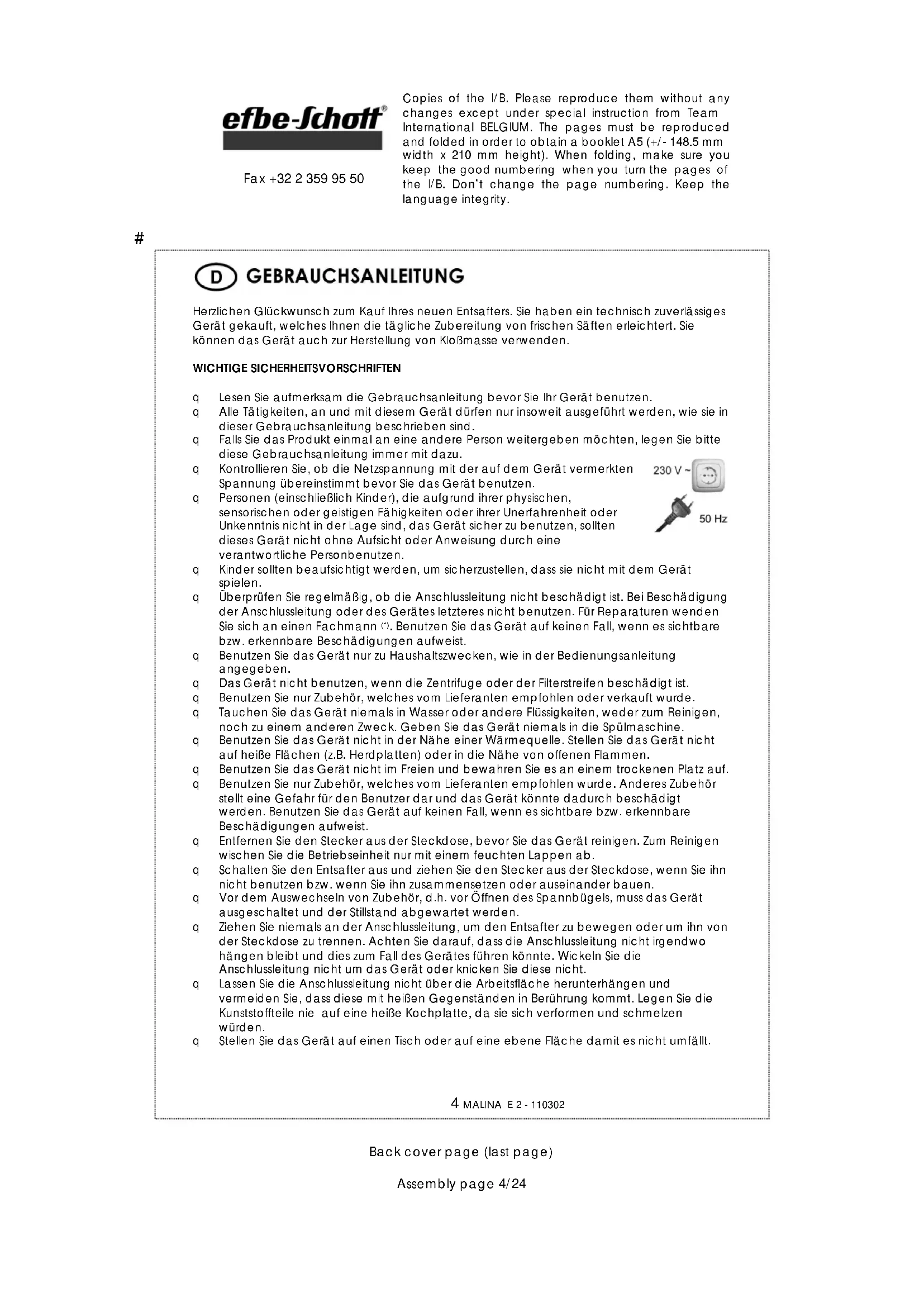 Back cover page (last page) Assembly page 4/24 Fax +32 2 359 95 50 Herzlichen Glückwunsch zum Kauf Ihres neuen Entsafters. Sie haben ein technisch zuverlässiges Gerät gekauft, welches Ihnen die tägliche Zubereitung von frischen Säften erleichtert. Sie können das Gerät auch zur Herstellung von Kloßmasse verwenden. WICHTIGE SICHERHEITSVORSCHRIFTEN