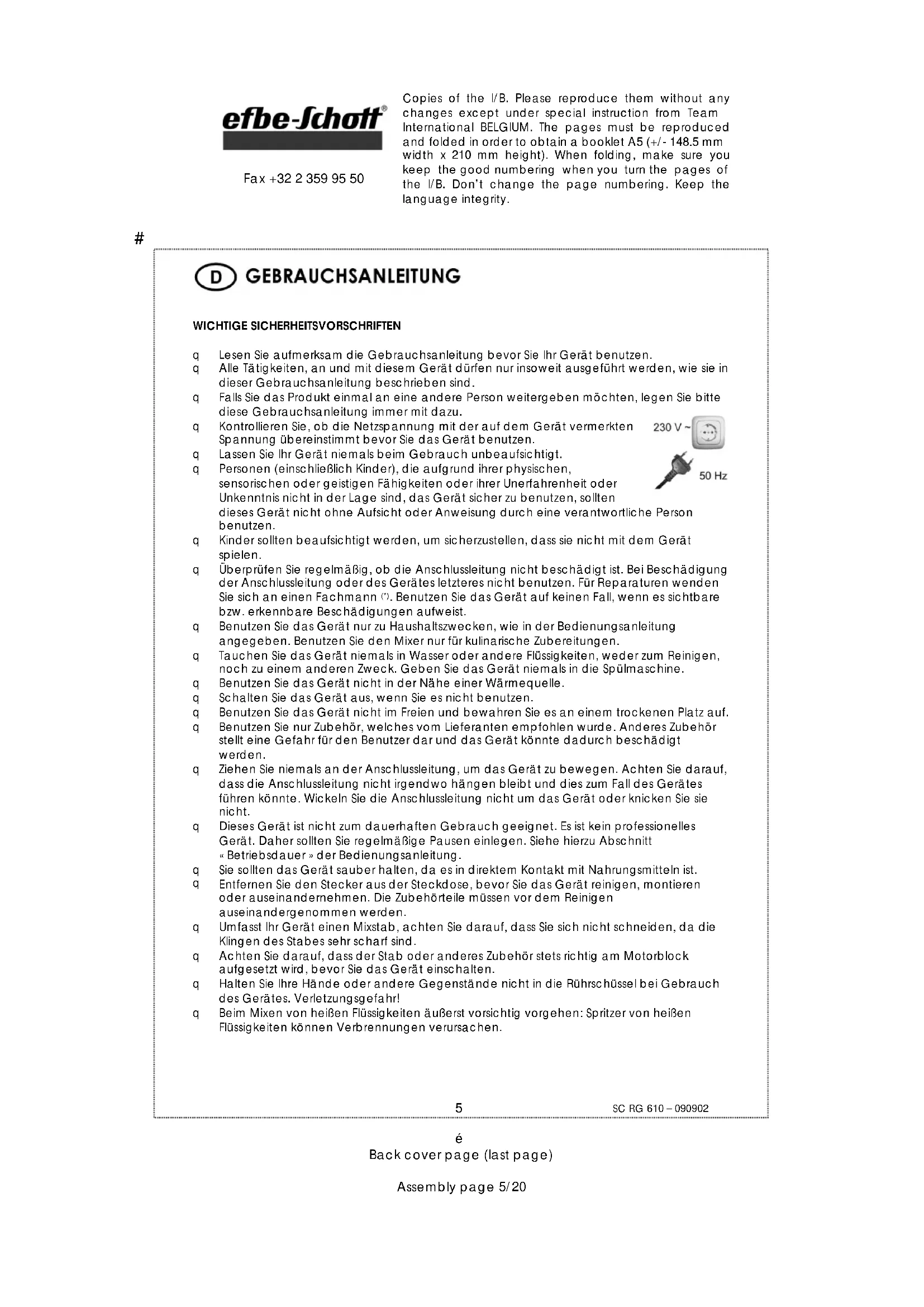 Zum Schutz unserer Umwelt und unserer Gesundheit sind Elektro- und Elektronik-Altgeräte nach bestimmten Regeln zu entsorgen. Dies fordert den Einsatz sowohl des Herstellers bzw. Lieferanten als auch des Verbrauchers. Aus diesem Grund darf dieses Gerät, wie das Symbol auf dem Typenschild bzw. auf der Verpackung zeigt, nicht in den unsortierten Restmüll gegeben werden. Der Verbraucher hat das Recht, dieses Gerät kostenfrei über kommunale Sammelstellen zu entsorgen; von dort aus wird die spezifische Behandlung, Verwertung bzw. das Recycling gem. den Erfordernissen der Richtlinie sichergestellt. Gewährleistungs- und Garantiebedingungen Für unsere Produkte gelten die gesetzlichen Bestimmungen für Gewährleistungsansprüche. Innerhalb dieser Zeit werden Mängel, welche auf Material- oder Herstellungsfehlern beruhen, behoben. Davon ausgeschlossen sind Beschädigungen an zerbrechlichen Teilen, Schäden, die durch übermäßige Beanspruchung, unsachgemäße Behandlung und Wartung sowie durch Nichtbeachtung der Gebrauchsanweisung entstehen, Schäden, welche durch Verschleiß oder infolge normaler Abnützung entstanden sind. Ebenso weisen wir darauf hin, dass die Gewährleistung bei Fremdeingriff erlischt. Hierbei wird der Verkäufer im Fall eines Schadens keine Haftung übernehmen. Sollten Sie einen Mangel feststellen, geben Sie bitte das vollständige Gerät an ihren Händler bzw. Verkaufsstelle. Gewährleistungsansprüche gelten nur in Verbindung mit dem zugehörigen Kassenbon bzw. der Kopie einer eventuellen Reparaturrechnung, die bei Inanspruchnahme der Serviceleistung unbedingt mit vorzulegen sind/ist. Sie haben auch die Möglichkeit, das gesäuberte Gerät mit einer kurzen, gut lesbaren Fehlerbeschreibung zusammen mit dem Kassenbon in einer frankierten Sendung an unseren Kundendienst in unserer Firma in Bad Blankenburg zu senden. Defekte Zubehörteile führen nicht zum Umtausch des Gerätes, sondern werden kostenlos im Austausch zugesandt. In diesem Fall bitte nicht das Gerät einschicken, sondern nur das defekte Zubehörteil bestellen! Glasbruchschäden sind grundsätzlich kostenpflichtig. Sowohl Defekte an Verbrauchszubehör bzw. Verschleißteilen, als auch Reinigung, Wartung oder der Austausch von Verschleißteilen, fallen nicht unter die Gewährleistung und sind deshalb kostenpflichtig! Nach Ablauf der Gesetzlichen Gewährleistungsfrist Reparaturen können kostenpflichtig von entsprechendem Fachpersonal oder Reparaturservice ausgeführt werden.# Copies of the I/B. Please reproduce them without any changes except under special instruction from Team International BELGIUM. The pages must be reproduced and folded in order to obtain a booklet A5 (+/- 148.5 mm width x 210 mm height). When folding, make sure you keep the good numbering when you turn the pages of the I/B. Don’t change the page numbering. Keep the language integrity.