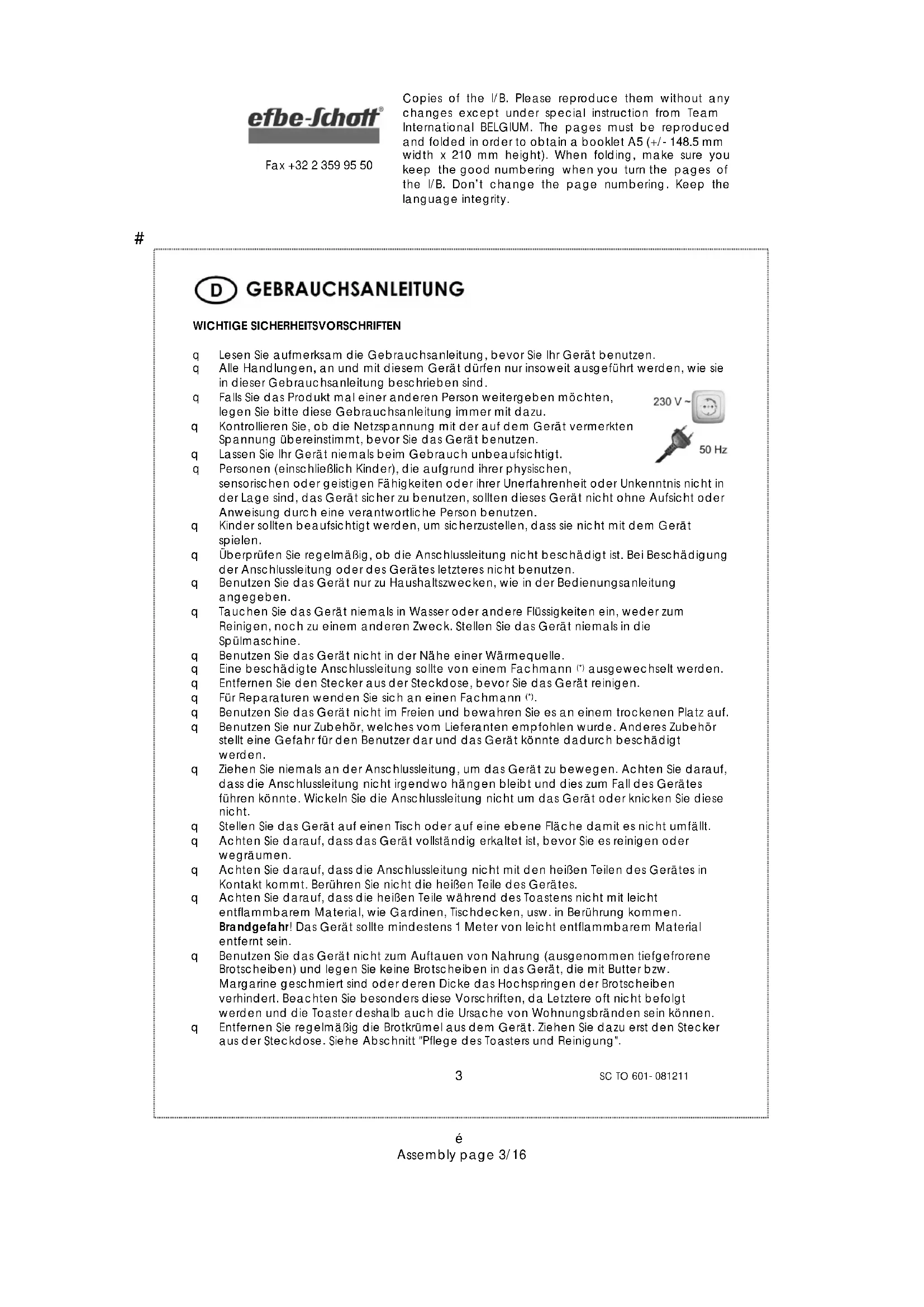 Laden Sie die Anleitung für Ihr Toaster kostenlos im PDF-Format! Finden Sie Ihr Handbuch TO 601 - Efbe-Schott und nehmen Sie Ihr elektronisches Gerät wieder in die Hand. Auf dieser Seite sind alle Dokumente veröffentlicht, die für die Verwendung Ihres Geräts notwendig sind. TO 601 von der Marke Efbe-Schott.