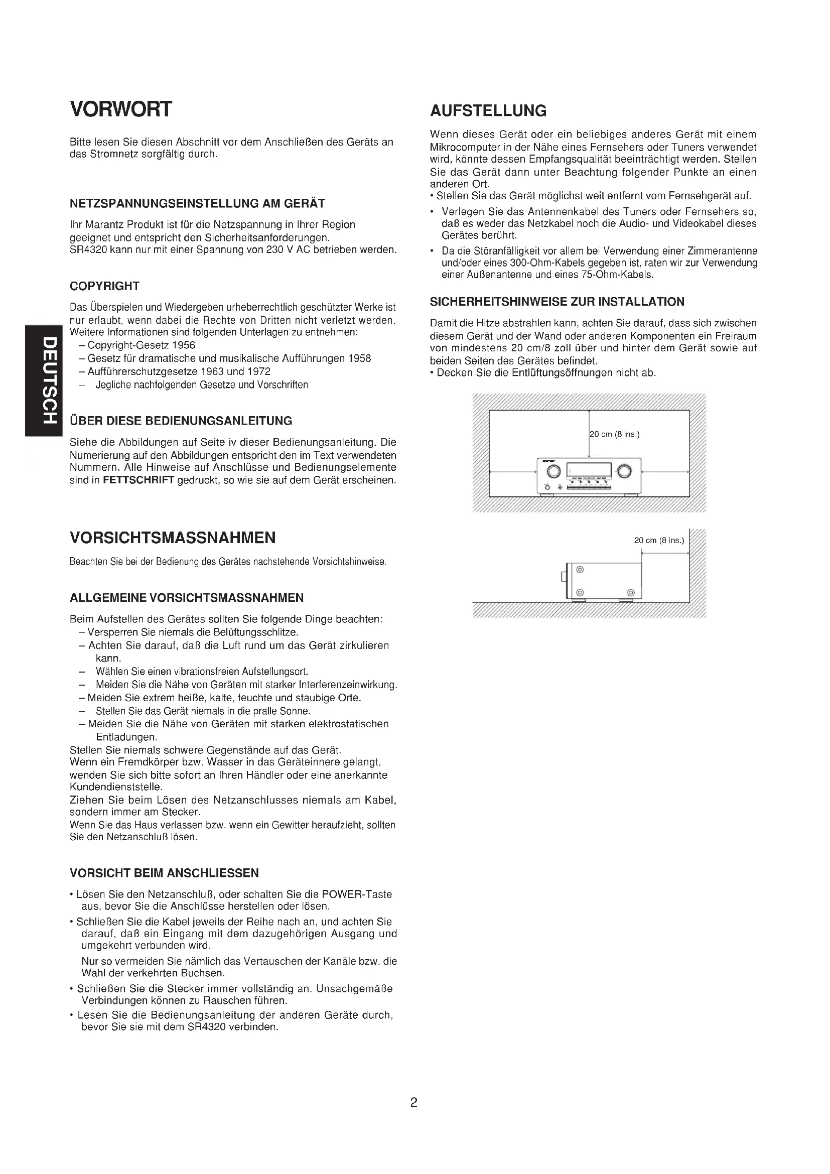 Ihr Marantz Produkt ist für die Netzspannung in Ihrer Regiongeeignet und entspricht den Sicherheitsanforderungen.SR4320 kann nur mit einer Spannung von 230 V AC betrieben werden. COPYRIGHT Das Überspielen und Wiedergeben urheberrechtlich geschützter Werke istnur erlaubt, wenn dabei die Rechte von Dritten nicht verletzt werden.Weitere Informationen sind folgenden Unterlagen zu entnehmen:– Copyright-Gesetz 1956– Gesetz für dramatische und musikalische Aufführungen 1958– Aufführerschutzgesetze 1963 und 1972 Jegliche nachfolgenden Gesetze und Vorschriften