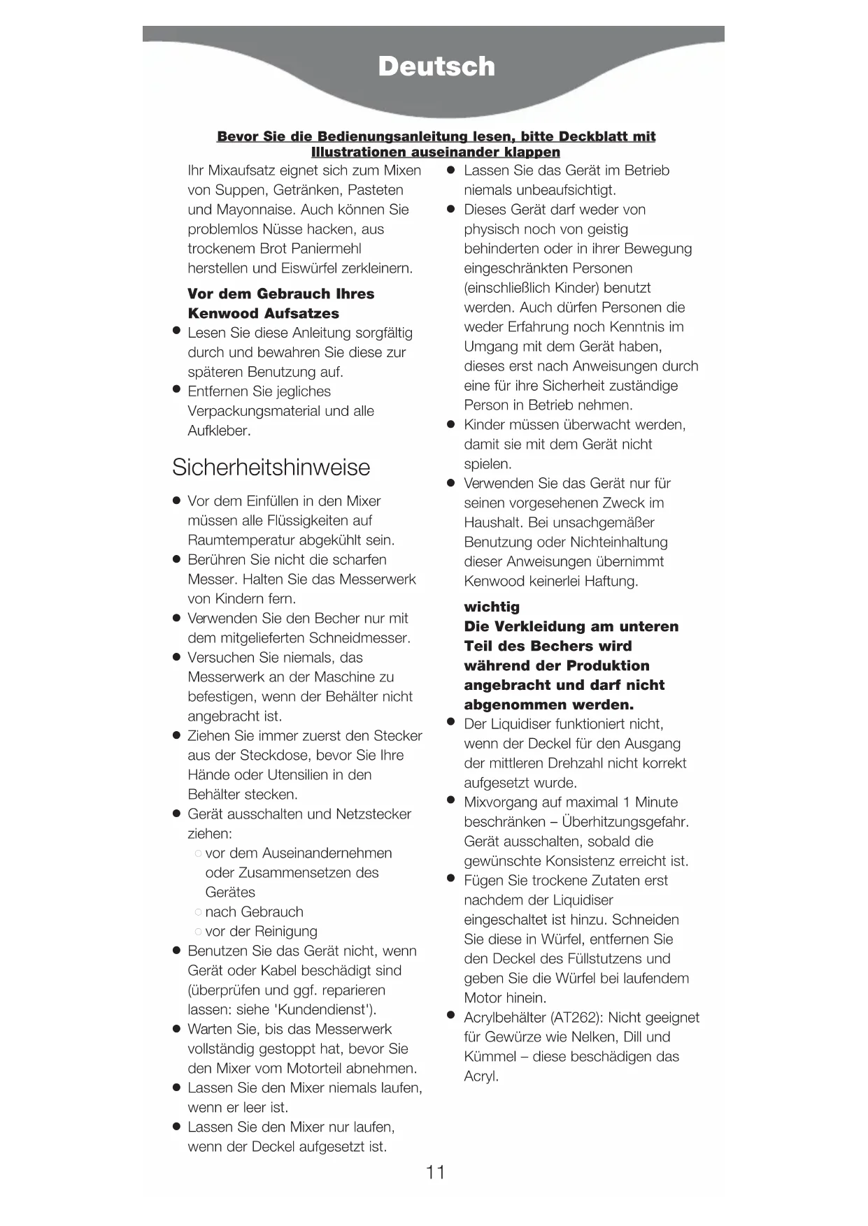 EG-RICHTLINIE 2002/96/EG. Am Ende seiner Nutzungszeit darf das Produkt NICHT mit dem Hausmüll entsorgt werden. Es muss zu einer örtlichen Sammelstelle für Sondermüll oder zu einem Fachhändler gebracht werden, der einen Rücknahmeservice anbietet. Die getrennte Entsorgung eines Haushaltsgerätes vermeidet mögliche negative Auswirkungen auf die Umwelt und die menschliche Gesundheit, die durch eine nicht vorschriftsmäßige Entsorgung bedingt sind. Zudem ermöglicht dies die Wiederverwertung der Materialien, aus denen das Gerät hergestellt wurde, was erhebliche Einsparungen an Energie und Rohstoffen mit sich bringt. 13Usare il frullatutto per preparare minestre, bevande, paté, maionese, pangrattato, per macinare i biscotti, la frutta secca e il ghiaccio. prima di utilizzare il proprio accessorio Kenwood
