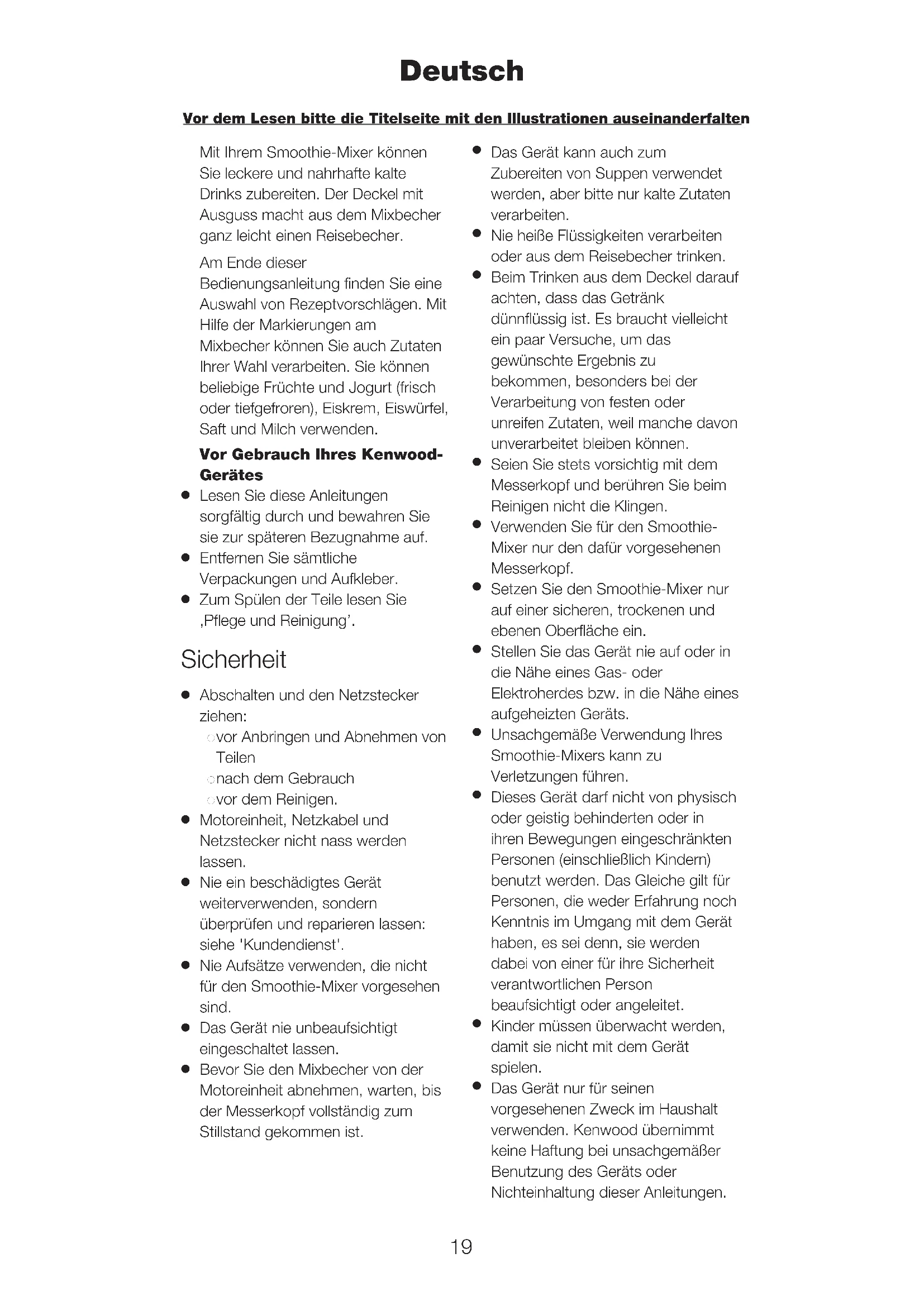 Das Gerät nur für seinen vorgesehenen Zweck im Haushalt verwenden. Kenwood übernimmt keine Haftung bei unsachgemäßer Benutzung des Geräts oder Nichteinhaltung dieser Anleitungen. Deutsch