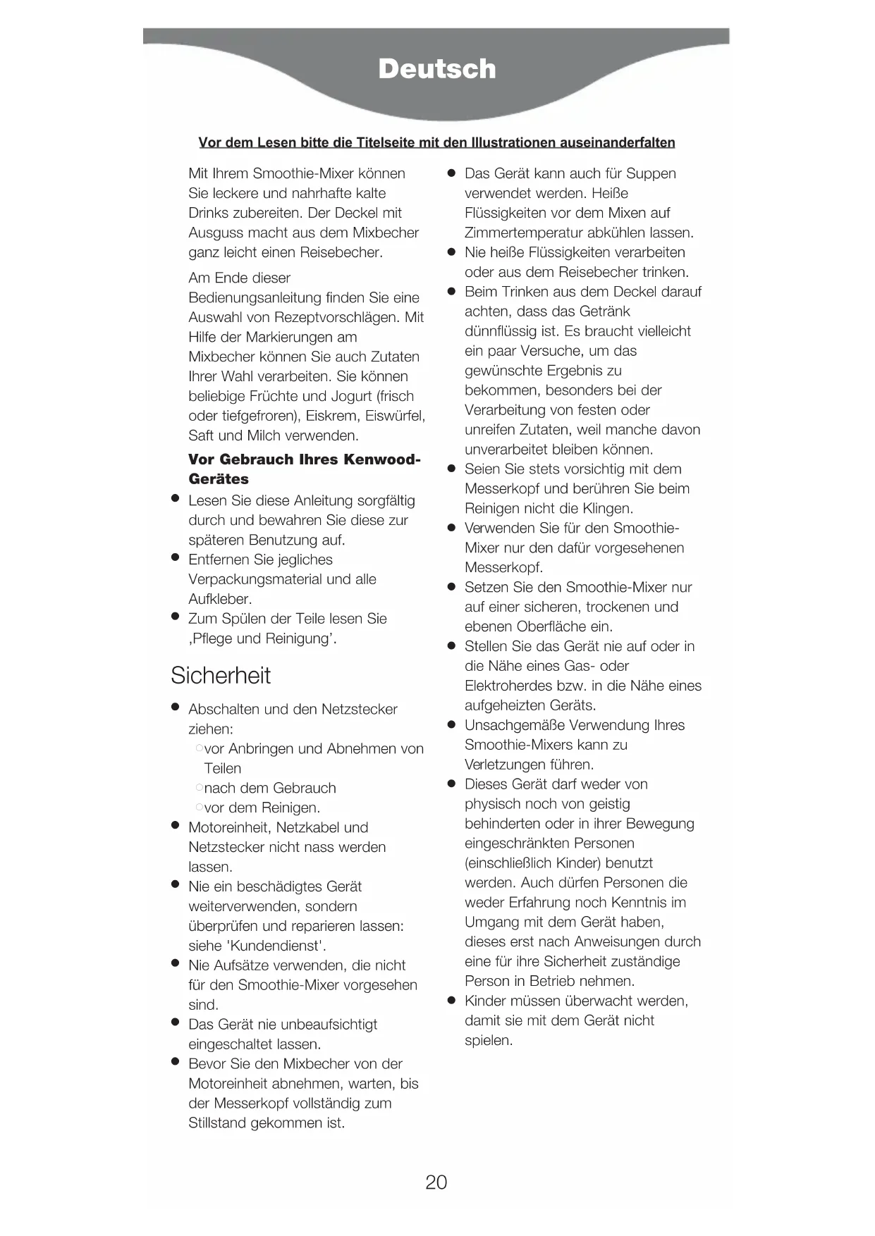 Vor dem Lesen bitte die Titelseite mit den Illustrationen auseinanderfalten● Verwenden Sie das Gerät nur für seinen vorgesehenen Zweck im Haushalt. Bei unsachgemäßer Benutzung oder Nichteinhaltung dieser Anweisungen übernimmt Kenwood keinerlei Haftung. Vor dem Einschalten