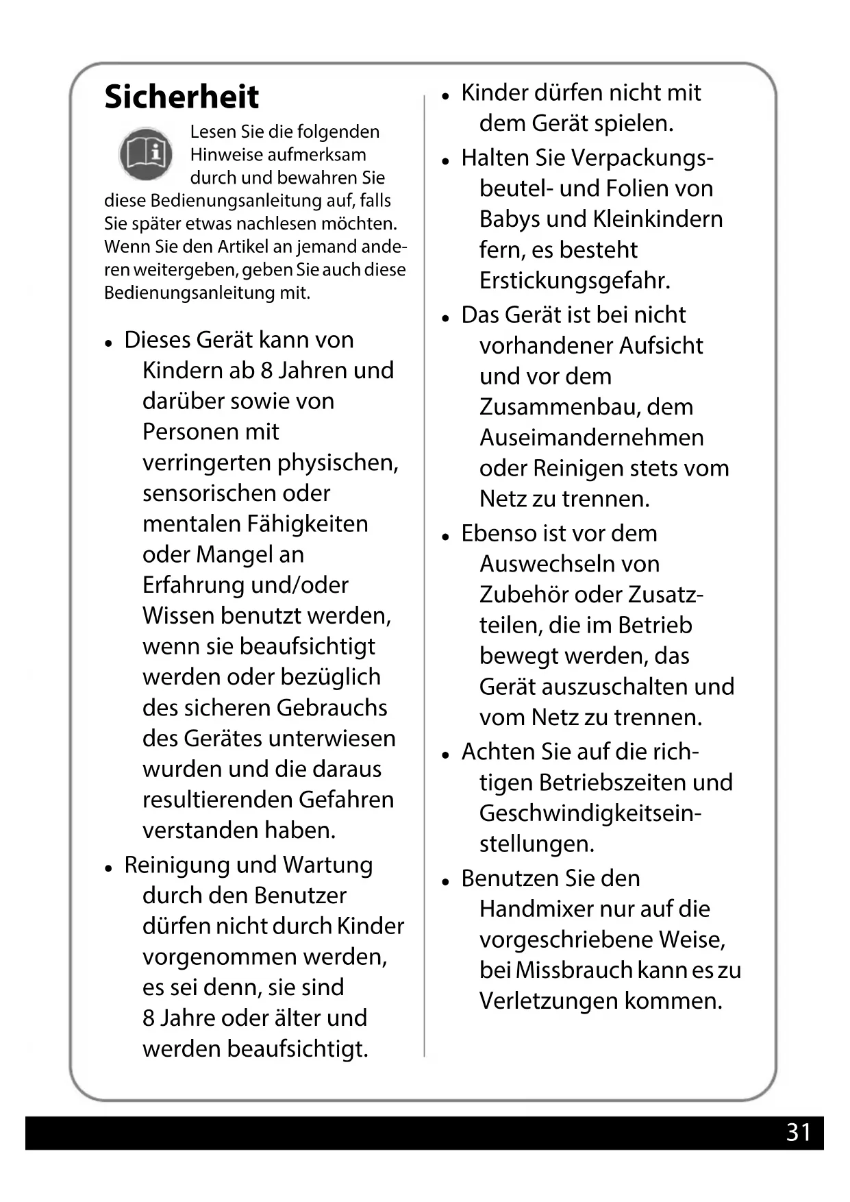 - Benutzen Sie den Handmixer nur auf die vorgeschriebene Weise, bei Missbrauch kann es zu Verletzungen kommt.