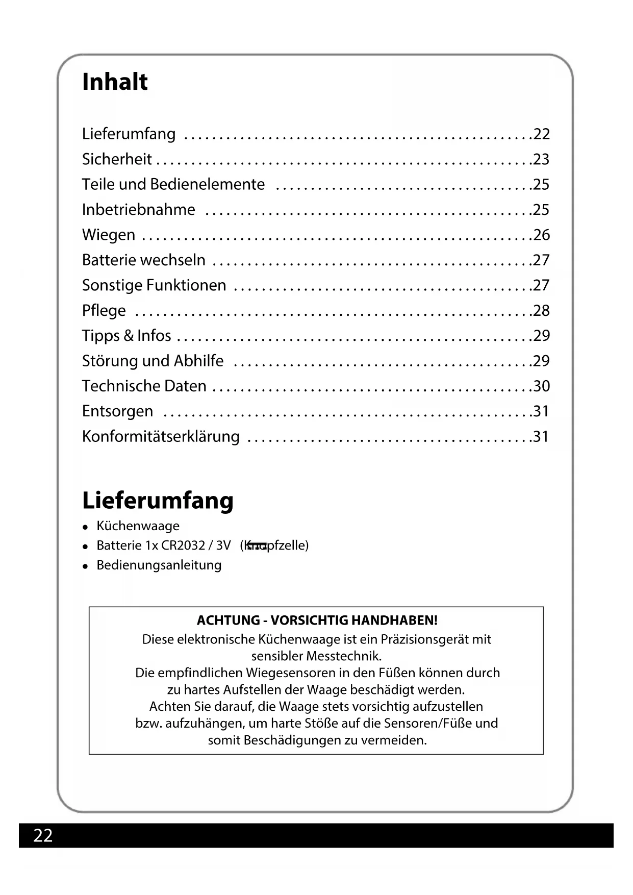 - Konformitätserklärung Lieferumfang z Küchenwaagez Batterie 1x CR2032 / 3V (Knopfzelle)z Bedienungsanleitung ACHTUNG - VORSICHTIG HANDHABEN! Diese elektronische Küchenwaage ist ein Präzisionsgerät mit sensibler Messtechnik. Die empfindlichen Wiegesensoren in den Füßen können durch zu hartes Aufstellen der Waage beschädigt werden. Achten Sie darauf, die Waage stets vorsichtig aufzustellen bzw. aufzuhängen, um harte Stöße auf die Sensoren/Füße und somit Beschädigungen zu vermeiden. Druckbuch Glaswaage BEL.book Seite 22 Donnerstag, 4. Oktober 2018 3:12 1523 Sicherheit Lesen Sie die folgenden Hinweise aufmerksam durch und bewahren Sie diese Bedienungsanleitung auf, falls Sie später etwas nachlesen möchten. Wenn Sie den Artikel an jemand ande- ren weitergeben, geben Sie auch diese Bedienungsanleitung mit. z Dieses Gerät kann von Kindern ab 8 Jahren und darüber sowie von Per- sonen mit verringerten physischen, sensorischen oder mentalen Fähig- keiten oder Mangel an Erfahrung und Wissen benutzt werden, wenn sie beaufsichtigt werden oder bezüglich des siche- ren Gebrauchs des Gerä- tes unterwiesen wurden und die daraus resultie- renden Gefahren ver- stehen. z Kinder dürfen nicht mit dem Gerät spielen. z Reinigung und Wartung durch den Benutzer dür- fen nicht durch Kinder vorgenommen werden, es sei denn, sie sind 8 Jahre oder älter und werden beaufsichtigt. z Batterien können lebens- gefährlich sein. Bewahren Sie deshalb Batterien für Kleinkinder unerreichbar auf. Wurde eine Batterie verschluckt oder ist auf andere Art in den Körper gelangt, muss sofort ärzt- liche Hilfe in Anspruch genommen werden. Anderenfalls kann es innerhalb von 2 Stunden zu schweren inneren Ver- ätzungen kommen, die zum Tode führen können. Verwendungszweck z Die Küchenwaage ist zum Wie- gen von Lebensmitteln und Klein- teilen im Privathaushalt konzi- piert. Die maximale Belastbarkeit - siehe „Technische Daten“ - darf dabei nicht überschritten wer- den. z Die Waage ist für die Verwen- dung im Privathaushalt und die dort üblicherweise anfallenden Mengen konzipiert. z Für die gewerbliche Nutzung, z. B. in Bäckereien, Restaurants etc., ist die Waage ungeeignet. Gefahr für Kinder z Halten Sie Kinder von Verpa- ckungsmaterial fern. Bei Ver- schlucken besteht Erstickungsge- fahr. Achten Sie auch darauf, dass der Verpackungsbeutel nicht über den Kopf gestülpt wird. Druckbuch Glaswaage BEL.book Seite 23 Donnerstag, 4. Oktober 2018 3:12 1524 Gefahr von Verletzungen z Achtung: Explosionsgefahr bei unsachgemäßem Auswechseln der Batterie. Ersatz nur durch denselben oder einen gleichwer- tigen Batterietyp. Beachten Sie die „Technischen Daten“. z Batterien dürfen nicht geladen, mit anderen Mitteln reaktiviert, auseinander genommen, ins Feu- er geworfen, erhitzt oder kurzge- schlossen werden. Ansonsten be- steht erhöhte Explosions- und Auslaufgefahr, außerdem können Gase entweichen! z Kontakt der Batterieflüssigkeit mit Haut, Augen und Schleim- häuten vermeiden. Bei Kontakt die betroffenen Stellen sofort mit reichlich klarem Wasser spülen und umgehend einen Arzt aufsu- chen. z Falls die Glas-Küchenwaage her- unterfällt und zerbricht, besteht Verletzungsgefahr durch Glas- splitter. Achtung - Sachschäden z Die Küchenwaage darf nicht in Wasser oder andere Flüssigkeiten getaucht werden. z Stellen Sie die Waage auf einen stabilen, ebenen Untergrund. z Überlasten Sie die Waage nicht. Beachten Sie die „Technischen Daten“. Legen Sie Gegenstände ausschließlich zum Wiegen auf die Waage. z Stellen Sie die Waage nicht in die Nähe von Geräten, von denen ei- ne elektromagnetische Strahlung ausgehen kann, wie z. B. Mobilte- lefone, Funkgeräte o. ä. Dieses kann zu falschen Display-Anzei- gen oder Fehlfunktionen führen. z An der Unterseite der Waage be- finden sich Gerätefüße. Da die Möbel- bzw. Bodenoberflächen aus den verschiedensten Materia- lien bestehen und mit den unter- schiedlichsten Pflegemitteln be- handelt werden, kann es nicht völlig ausgeschlossen werden, dass manche dieser Stoffe Be- standteile enthalten, die die Ge- rätefüße angreifen und aufwei- chen. Legen Sie ggf. eine rutsch- feste Unterlage unter die Gerätefüße. z Nehmen Sie die Batterie aus dem Gerät heraus, wenn diese ver- braucht ist oder wenn Sie die Waage länger nicht benutzen. So vermeiden Sie Schäden, die durch Auslaufen entstehen kön- nen. z Setzen Sie Batterien keinen extre- men Bedingungen aus, indem Sie diese z. B. auf Heizkörpern oder unter direkter Sonneneinstrah- lung lagern. Erhöhte Auslaufge- fahr! z Reinigen Sie Batterie- und Geräte- kontakte bei Bedarf vor dem Ein- legen. z Nehmen Sie keine Veränderun- gen an dem Gerät vor. Lassen Sie Reparaturen nur von einer Fach- werkstatt durchführen und be- achten Sie die Garantiebedingun- gen. z Verwenden Sie keinesfalls harte, kratzende oder scheuernde Reini- gungsmittel o. ä., um die Waage zu reinigen. Hierbei könnte die Oberfläche zerkratzen. Druckbuch Glaswaage BEL.book Seite 24 Donnerstag, 4. Oktober 2018 3:12 1525 Teile und Bedienelemente Inbetriebnahme Bei Auslieferung ist die Batterie bereits eingelegt und zum Schutz vor vorzeitiger Entladung mit einem Iso-Streifen versehen. Um die Waage in Betrieb zu nehmen, müssen Sie den Iso-Streifen entfernen. Das Batteriefach befindet sich auf der Geräte-Unterseite. p. 31