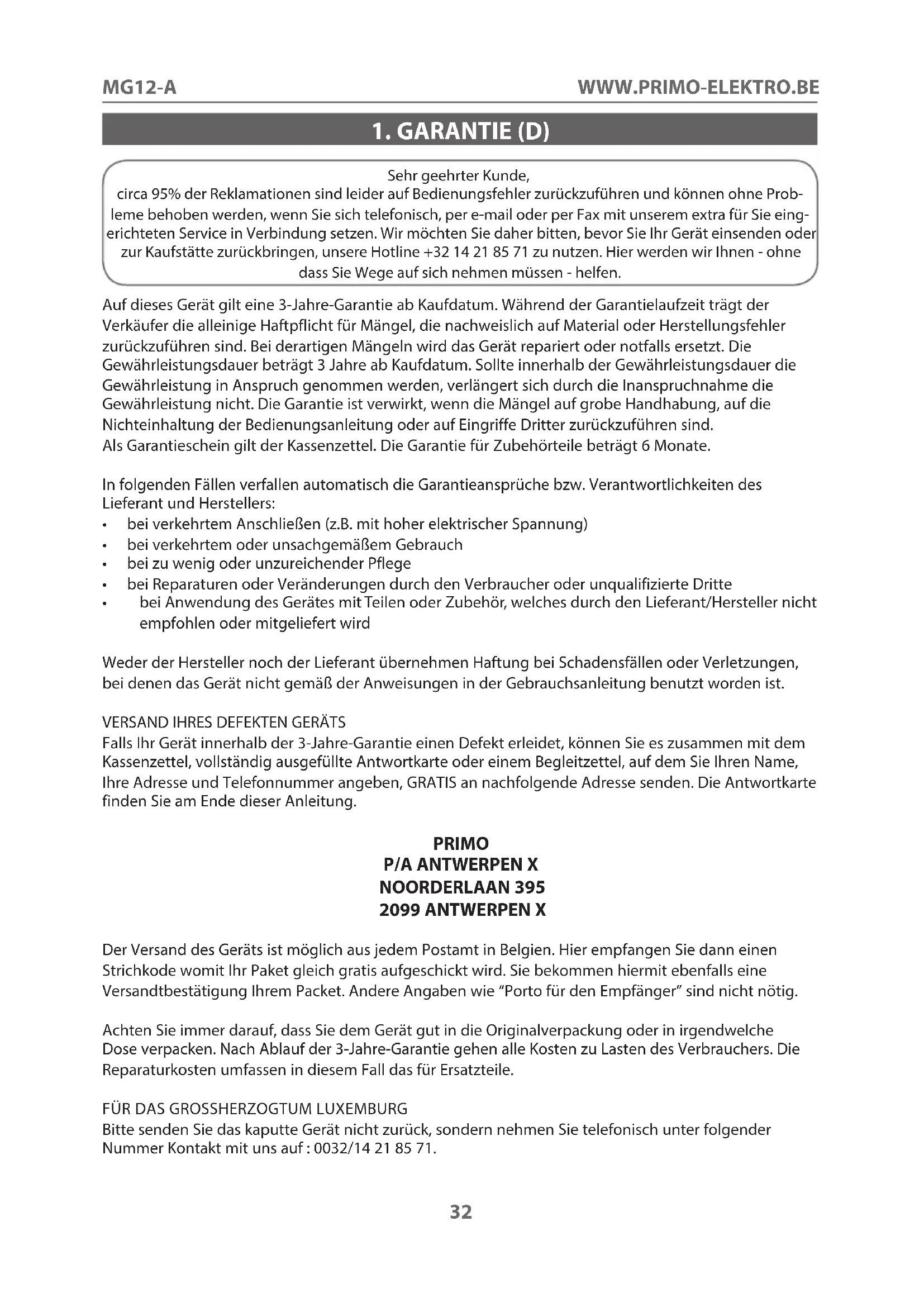 Bitte senden Sie das kaputte Gerät nicht zurück, sondern nehmen Sie telefonisch unter folgender Nummer Kontakt mit uns auf : 0032/14 21 85 71.MG12-A
