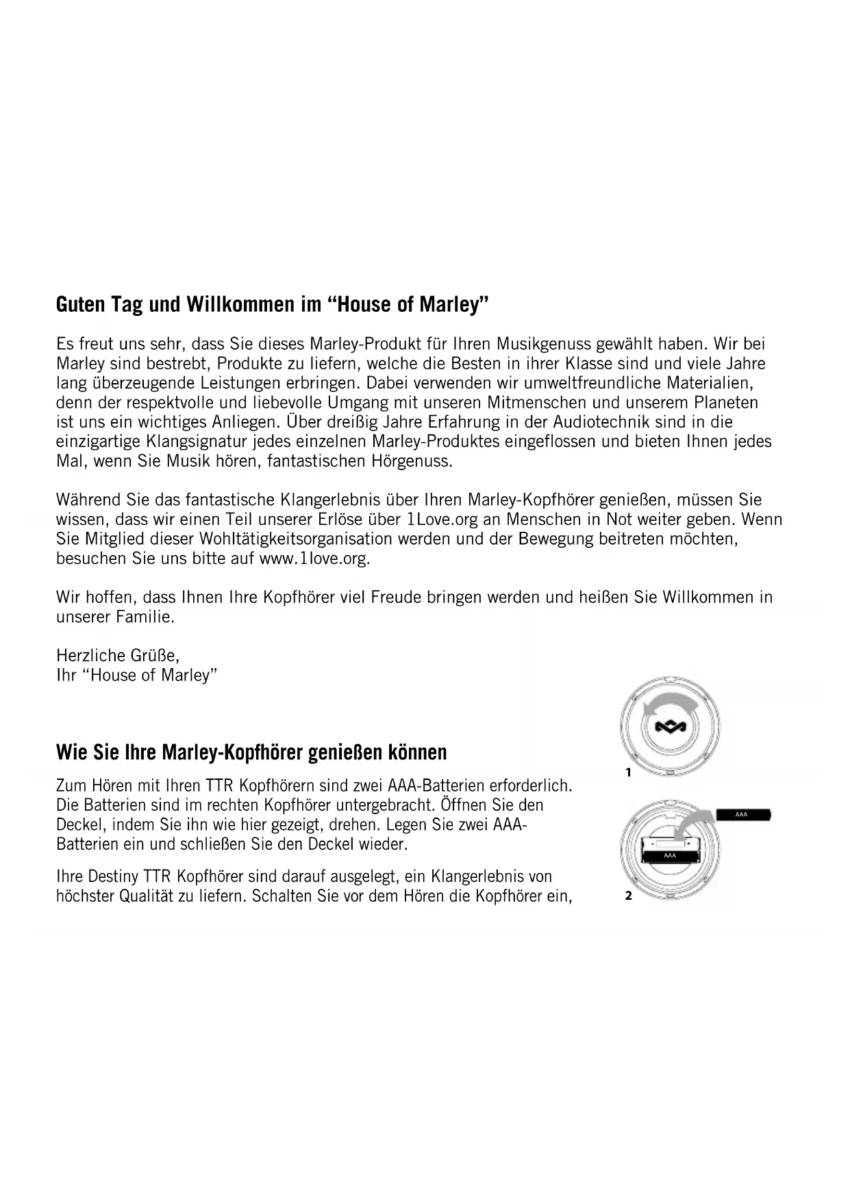 Pour vous prévaloir de la garantie de votre produit House of Marley, LLC, envoyer le produit ainsi que votre reçu (comme preuve d’achat) par la poste, port payé, à l’adresse suivante (aucun envoi C.R. ne sera accepté): The House of Marley, LLC 344, chemin Consumers Toronto ON M2J 1P8 The House of Marley, LLC n’autorise personne à obliger The House of Marley, LLC à respecter des conditions ne figurant pas dans les conditions formulées aux présentes. Cette garantie ne couvre pas les dommages causés par une mauvaise utilisation ou un usage abusif, ou toute autre condition hors du contrôle de The House of Marley, LLC. LA GARANTIE FOURNIE AUX PRÉSENTES CONSTITUE UNE GARANTIE UNIQUE ET EXCLUSIVE. THE HOUSE OF MARLEY, LLC N’ACCEPTE AUCUNE RESPONSABILITÉ POUR DOMMAGES DIRECTS, INDIRECTS OU PARTICULIERS. THE HOUSE OF MARLEY, LLC SE RÉSERVE LE DROIT DE REMPLACER LE PRODUIT EN GUISE ET LIEU DE RÉPARATION OU REMPLACEMENT. Cette garantie ne s’étend pas à l’achat de produits ouverts, usagés, réparés, réusinés ou refermés, y compris, mais non limité à, la vente de ces produits sur les sites d’enchères sur Internet. Cette garantie vous donne des droits juridiques particuliers. Vous pouvez bénéficier de droits supplémentaires pouvant varier d’un État à un autre.Guten Tag und Willkommen im “House of Marley” Es freut uns sehr, dass Sie dieses Marley-Produkt für Ihren Musikgenuss gewählt haben. Wir bei Marley sind bestrebt, Produkte zu liefern, welche die Besten in ihrer Klasse sind und viele Jahre lang überzeugende Leistungen erbringen. Dabei verwenden wir umweltfreundliche Materialien, denn der respektvolle und liebevolle Umgang mit unseren Mitmenschen und unserem Planeten ist uns ein wichtiges Anliegen. Über dreißig Jahre Erfahrung in der Audiotechnik sind in die einzigartige Klangsignatur jedes einzelnen Marley-Produktes eingeflossen und bieten Ihnen jedes Mal, wenn Sie Musik hören, fantastischen Hörgenuss. Während Sie das fantastische Klangerlebnis über Ihren Marley-Kopfhörer genießen, müssen Sie wissen, dass wir einen Teil unserer Erlöse über 1Love.org an Menschen in Not weiter geben. Wenn Sie Mitglied dieser Wohltätigkeitsorganisation werden und der Bewegung beitreten möchten, besuchen Sie uns bitte auf www.1love.org. Wir hoffen, dass Ihnen Ihre Kopfhörer viel Freude bringen werden und heißen Sie Willkommen in unserer Familie. Herzliche Grüße, Ihr “House of Marley” Wie Sie Ihre Marley-Kopfhörer genießen können Zum Hören mit Ihren TTR Kopfhörern sind zwei AAA-Batterien erforderlich. Die Batterien sind im rechten Kopfhörer untergebracht. Öffnen Sie den Deckel, indem Sie ihn wie hier gezeigt, drehen. Legen Sie zwei AAA- Batterien ein und schließen Sie den Deckel wieder. Ihre Destiny TTR Kopfhörer sind darauf ausgelegt, ein Klangerlebnis von höchster Qualität zu liefern. Schalten Sie vor dem Hören die Kopfhörer ein, AAA AAA