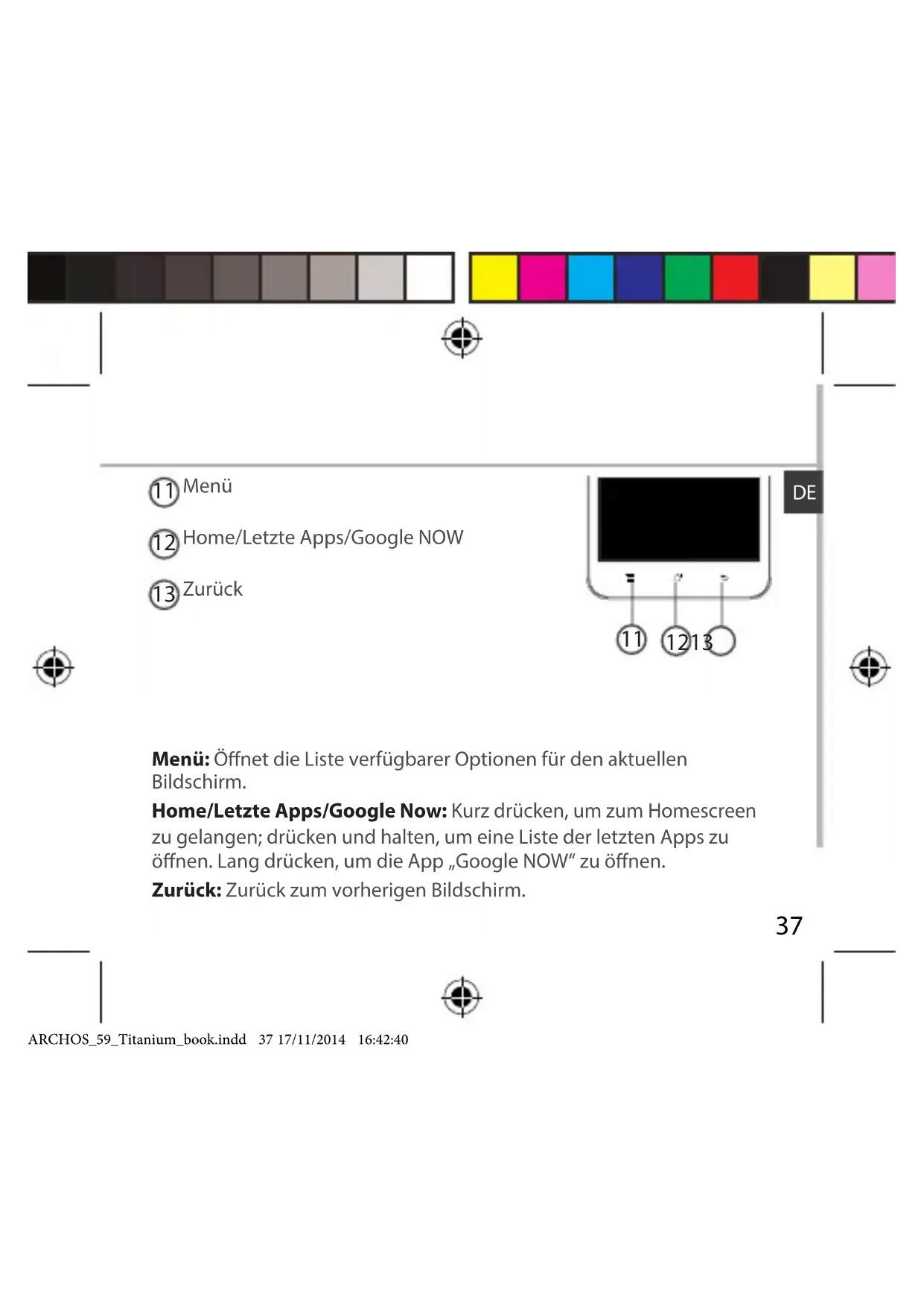 Menü Home/Letzte Apps/Google NOW Zurück Menü: Önet die Liste verfügbarer Optionen für den aktuellen Bildschirm. Home/Letzte Apps/Google Now: Kurz drücken, um zum Homescreen zu gelangen; drücken und halten, um eine Liste der letzten Apps zu önen. Lang drücken, um die App „Google NOW“ zu önen. Zurück: Zurück zum vorherigen Bildschirm. ARCHOS_59_Titanium_book.indd 37 17/11/2014 16:42:4038 Montage Önen