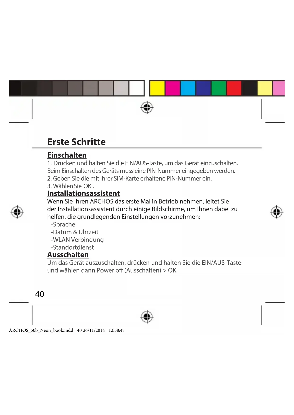 Slot1 2G/3G-SIM-Karte Slot2 2G-SIM-Karte Slot3 Speicherkarte Heben Sie die Rückabdeckung mithilfe der Einkerbung an ARCHOS_50b_Neon_book.indd 39 26/11/2014 12:38:4640 Einschalten