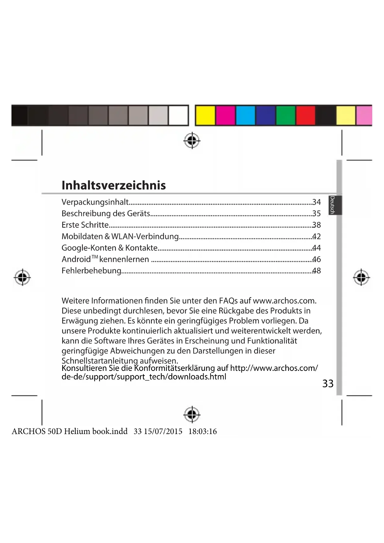 Weitere Informationen nden Sie unter den FAQs auf www.archos.com. Diese unbedingt durchlesen, bevor Sie eine Rückgabe des Produkts in Erwägung ziehen. Es könnte ein geringfügiges Problem vorliegen. Da unsere Produkte kontinuierlich aktualisiert und weiterentwickelt werden, kann die Software Ihres Gerätes in Erscheinung und Funktionalität geringfügige Abweichungen zu den Darstellungen in dieser Schnellstartanleitung aufweisen. Konsultieren Sie die Konformitätserklärung auf http://www.archos.com/ de-de/support/support_tech/downloads.html ARCHOS 50D Helium book.indd 33 15/07/2015 18:03:1634 Verpackungsinhalt In der Verpackung müssen folgende Elemente enthalten sein: - ARCHOS 50D Helium - Batterie - Headset - USB-Kabel - Ladegerät - Benutzerhandbuch - Garantie, Impressum und Sicherheitshinweise Die mit Ihrem Gerät mitgelieferten Elemente und das verfügbare Zubehör können je nach Region oder Dienstleister abweichen. Die mitgelieferten Elemente wurden ausschließlich für Ihr Gerät entwickelt und sind mit anderen Geräten nicht kompatibel. Nicht genehmigtes Zubehör kann zu einer Fehlfunktion Ihres Geräts führen. ARCHOS 50D Helium book.indd 34 15/07/2015 18:03:1635